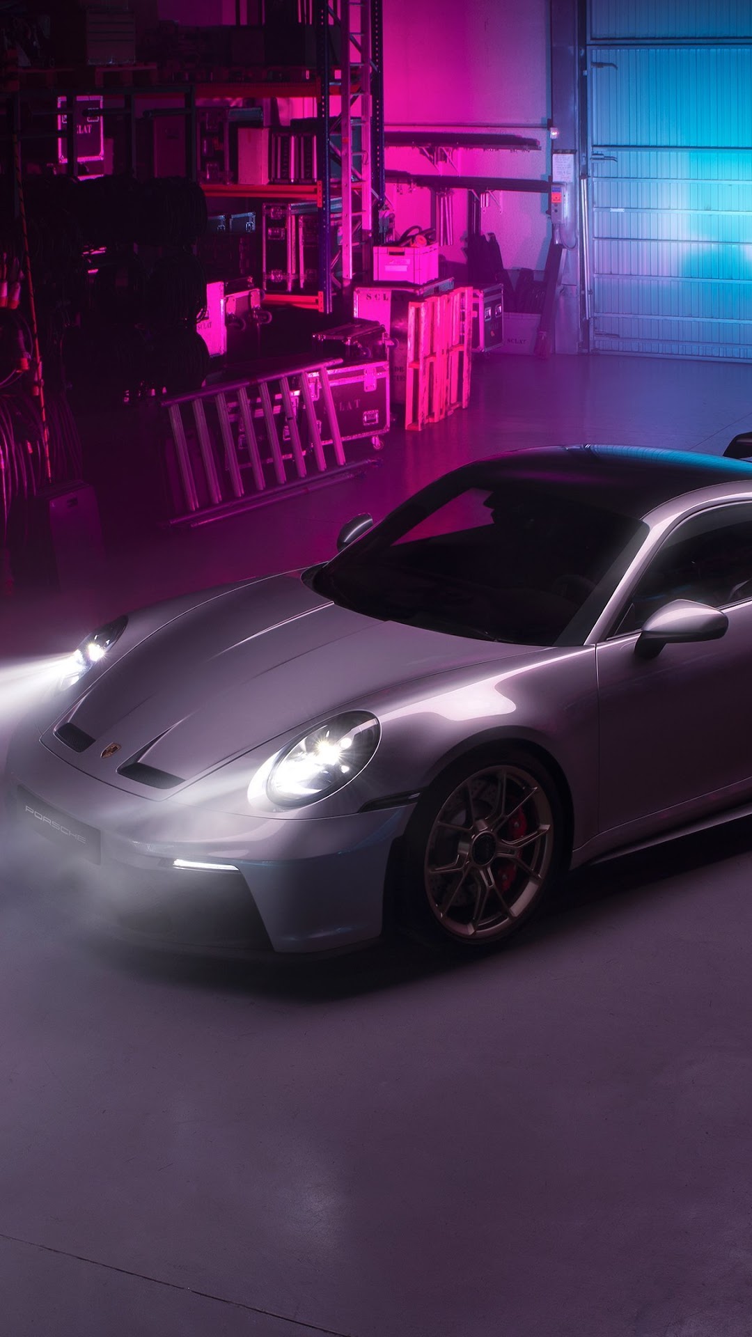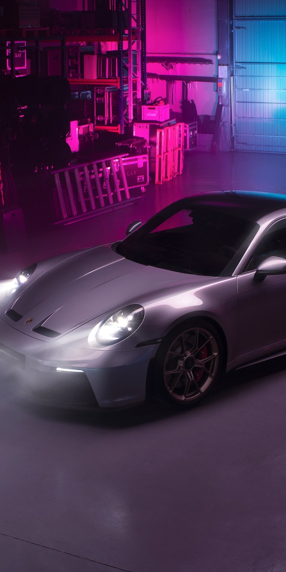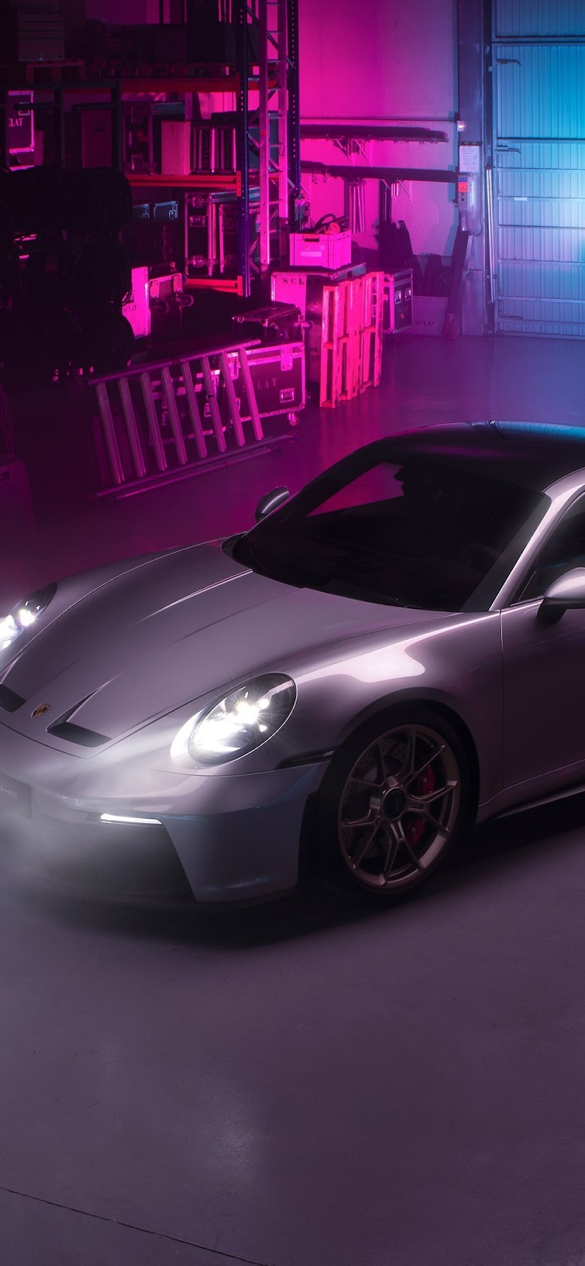 Porsche, Gt3, Silver, Neon, Warehouse 4K Desktop and Mobile Wallpaper Background with a maximum resolution of 3840x2160 px.
