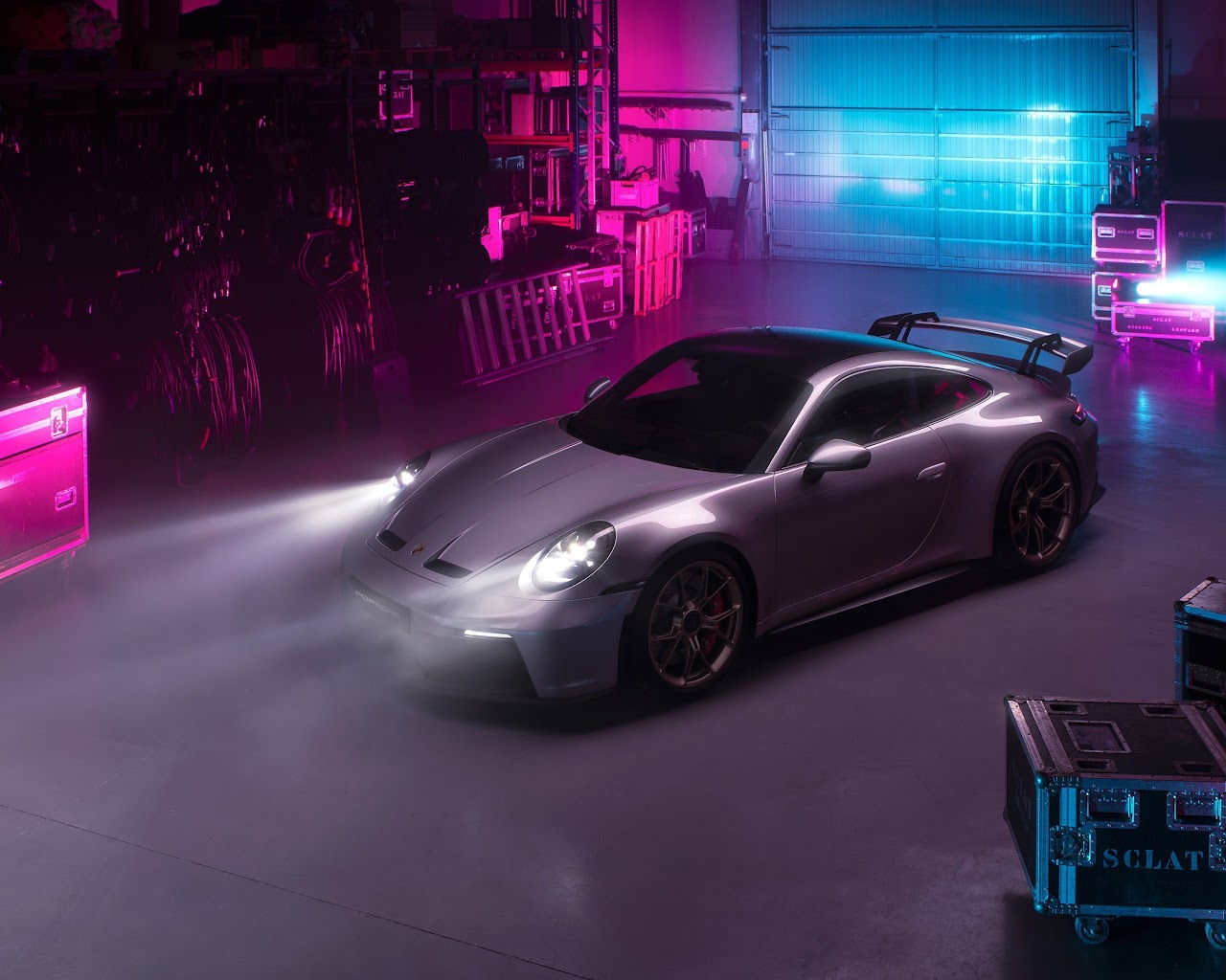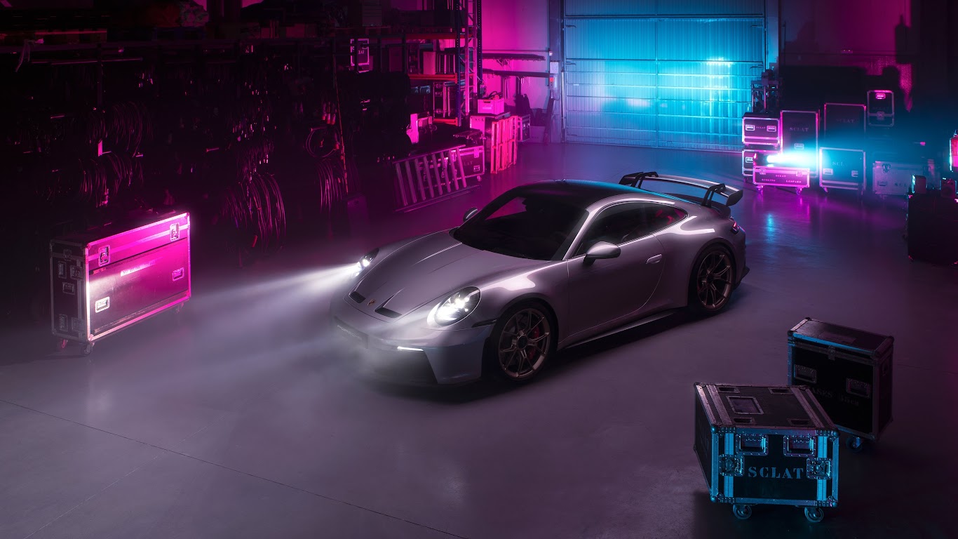 Porsche, Gt3, Silver, Neon, Warehouse 4K Desktop Wallpaper