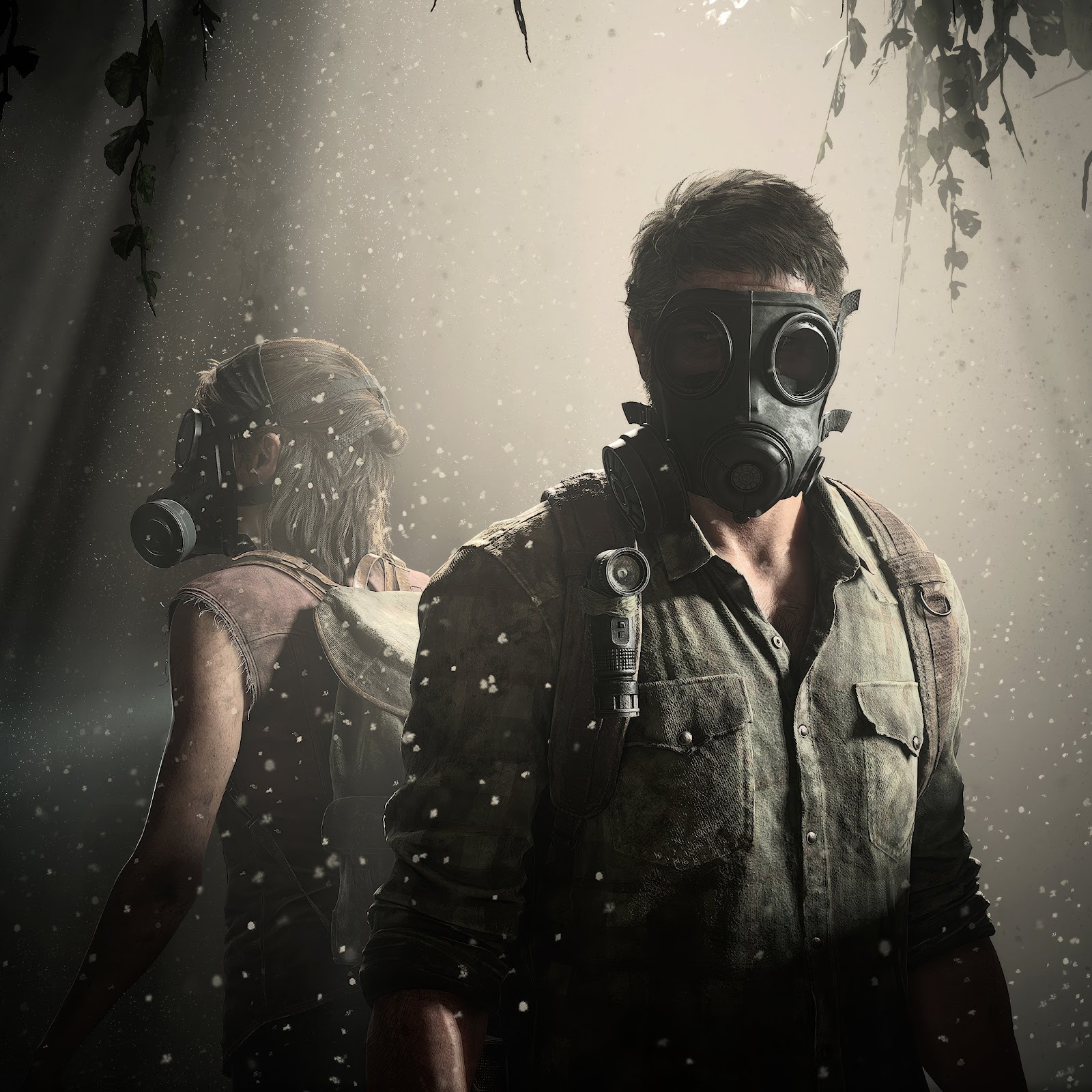The Last Of Us, Joel, Ellie, Gas Mask 4K Desktop Wallpaper Background with a maximum resolution of 3840x2160 px.