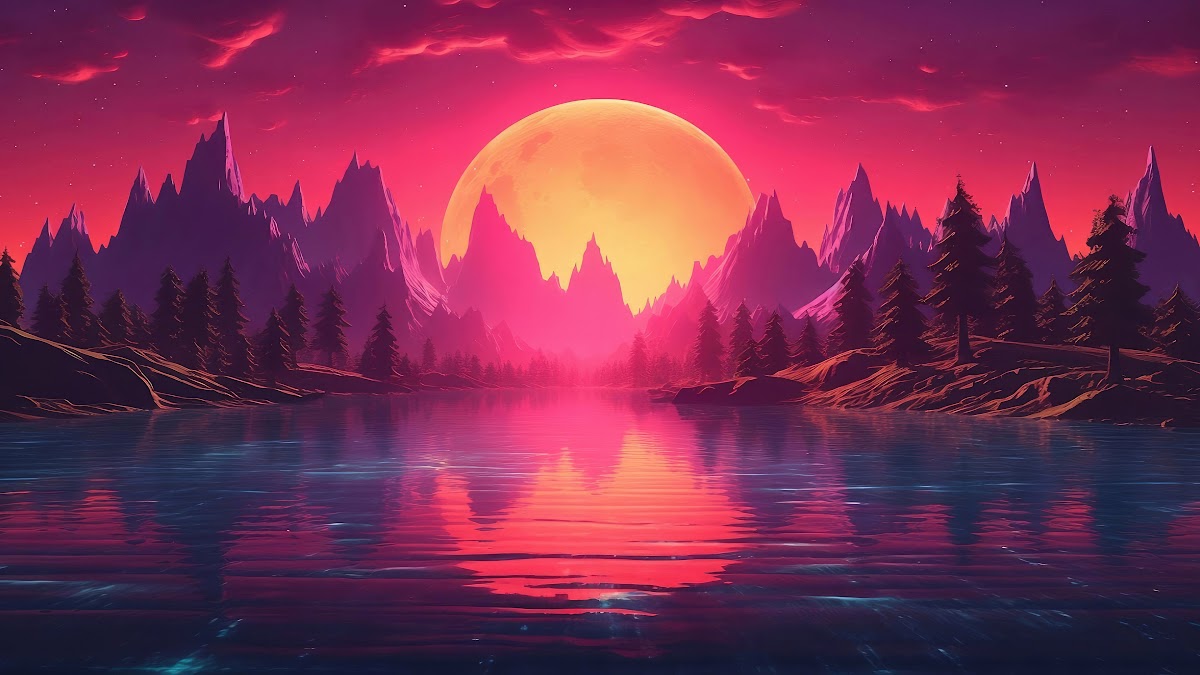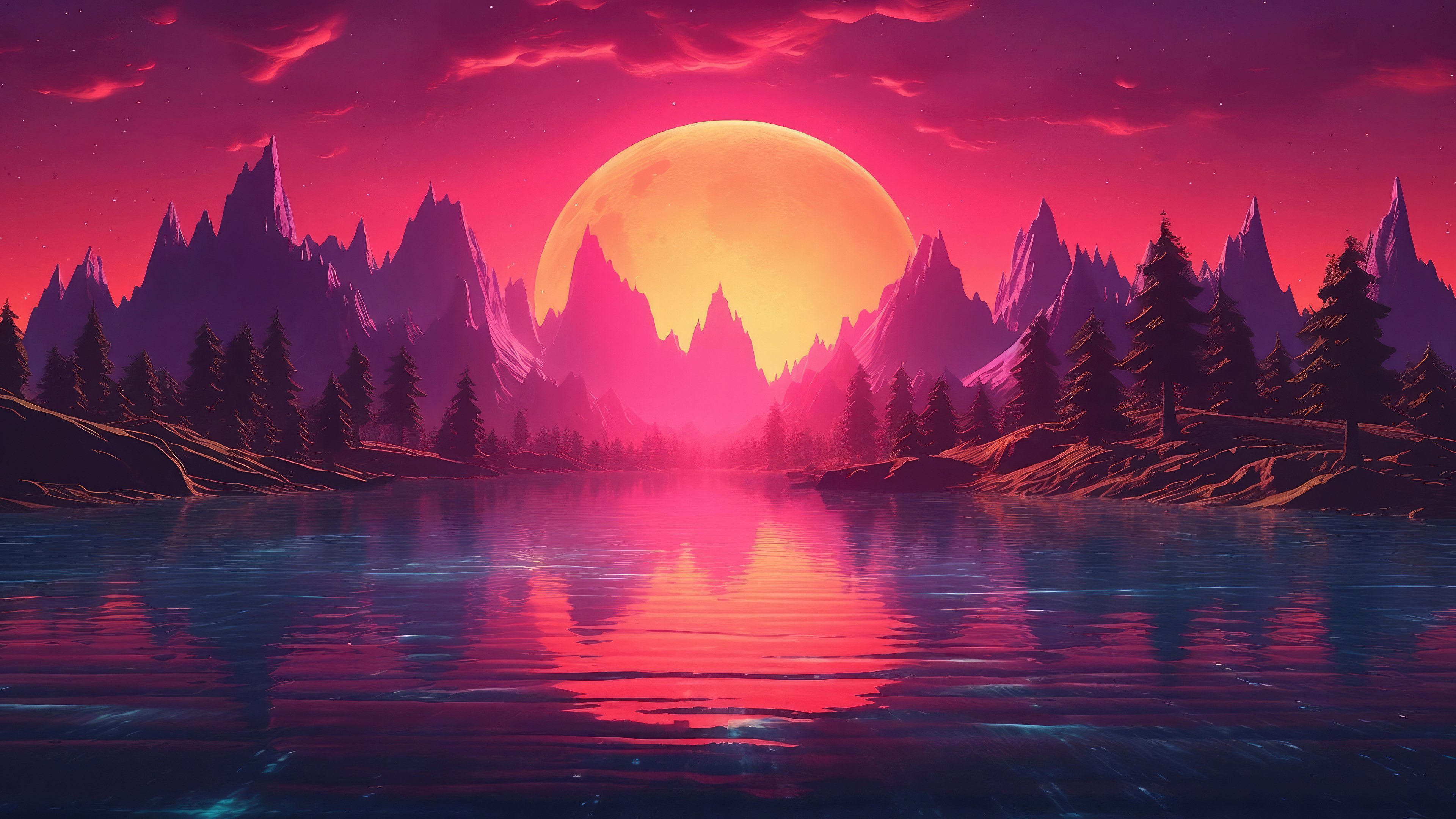 Mountains, Moon, Lake, Forest, Pink Sky 4K Wallpaper Background with a maximum resolution of 3840x2160 px.