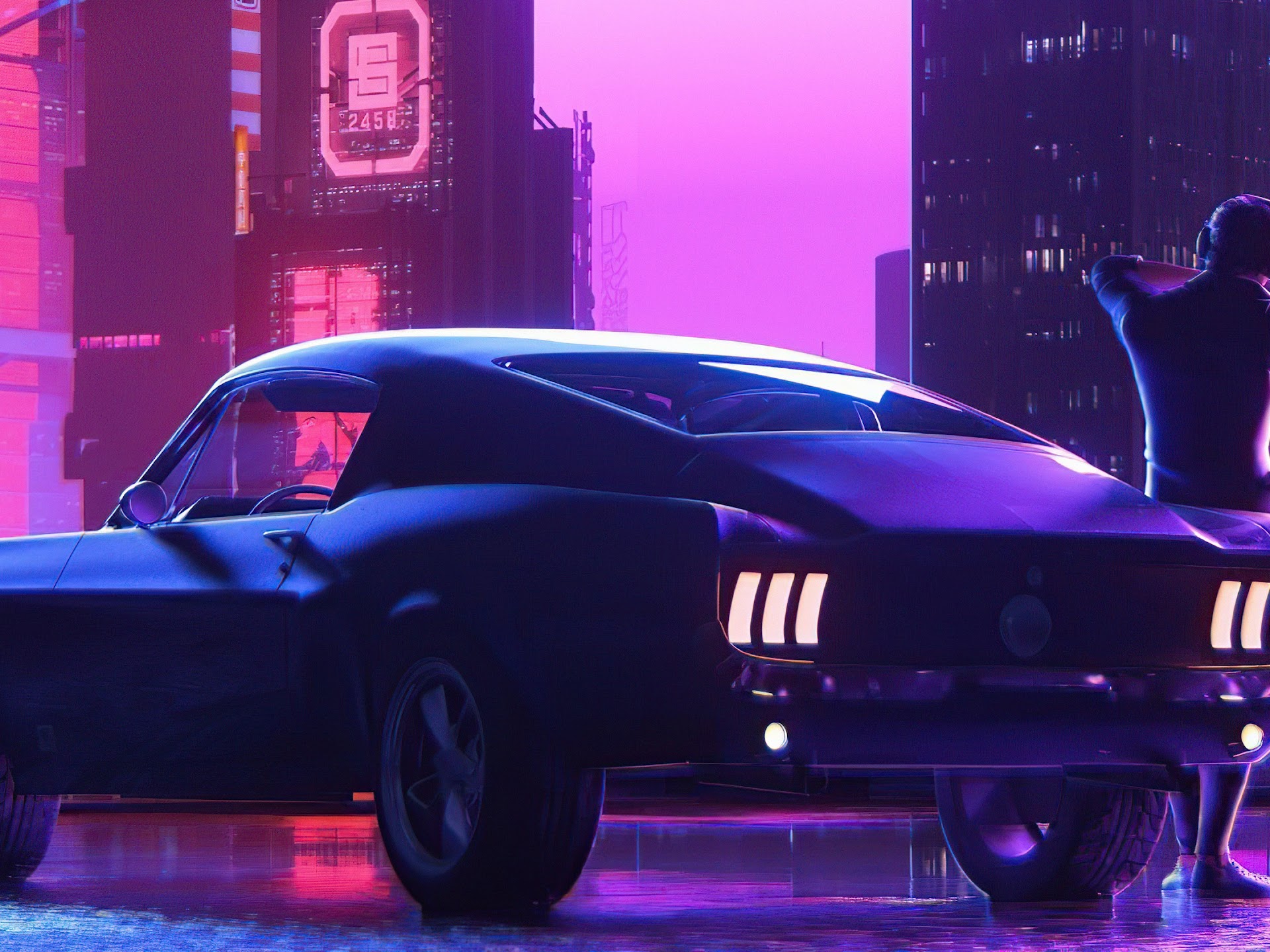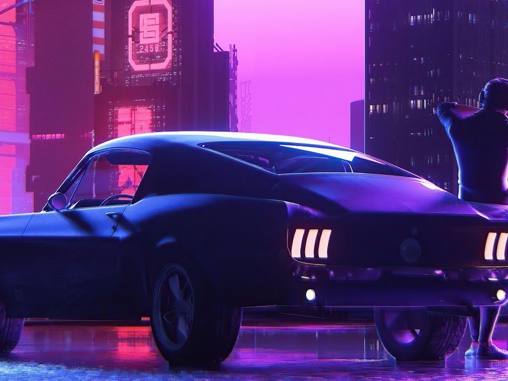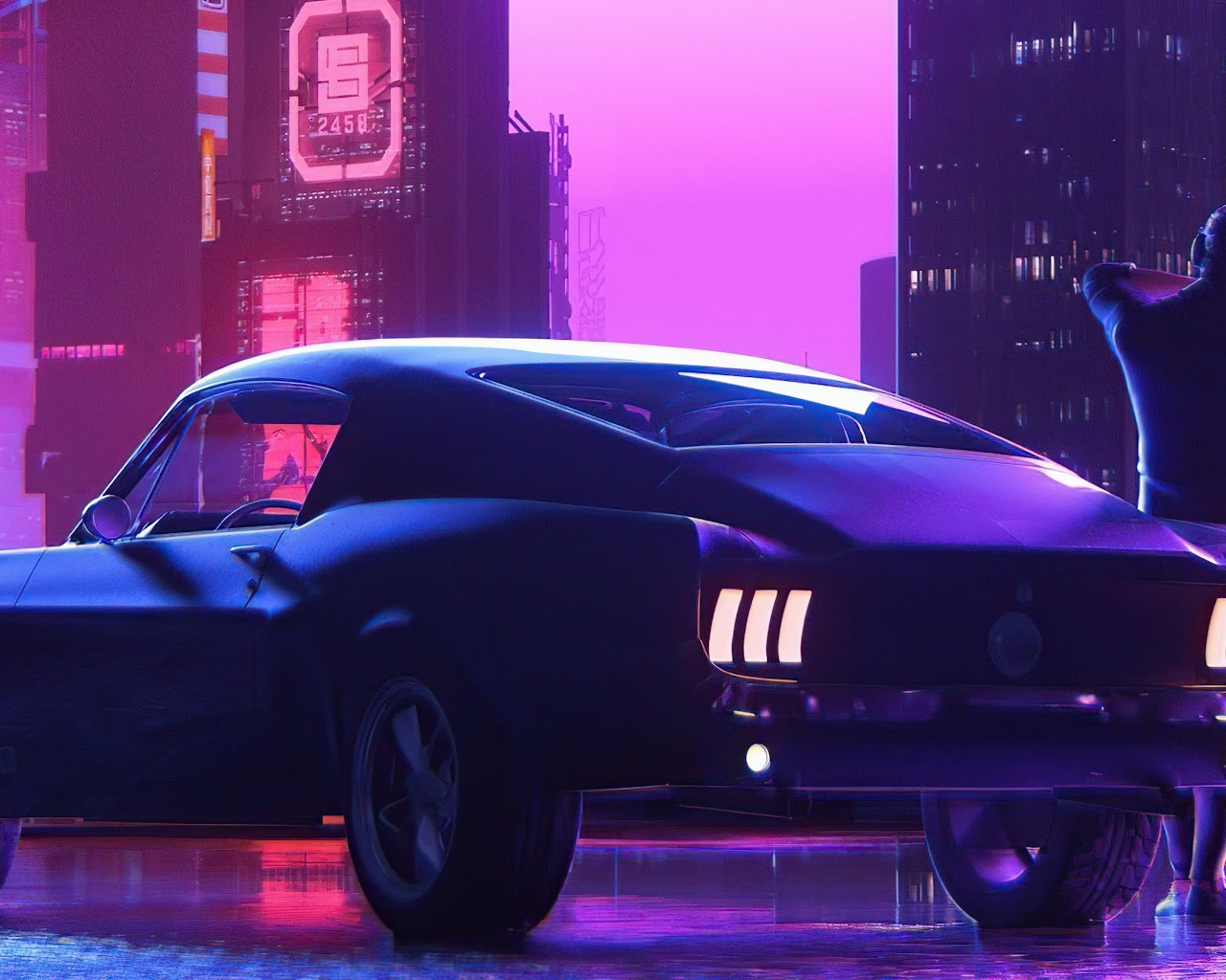 Cyberpunk, Mustang, Neon, Retrowave 4K Desktop Wallpaper Background with a maximum resolution of 3840x2160 px.