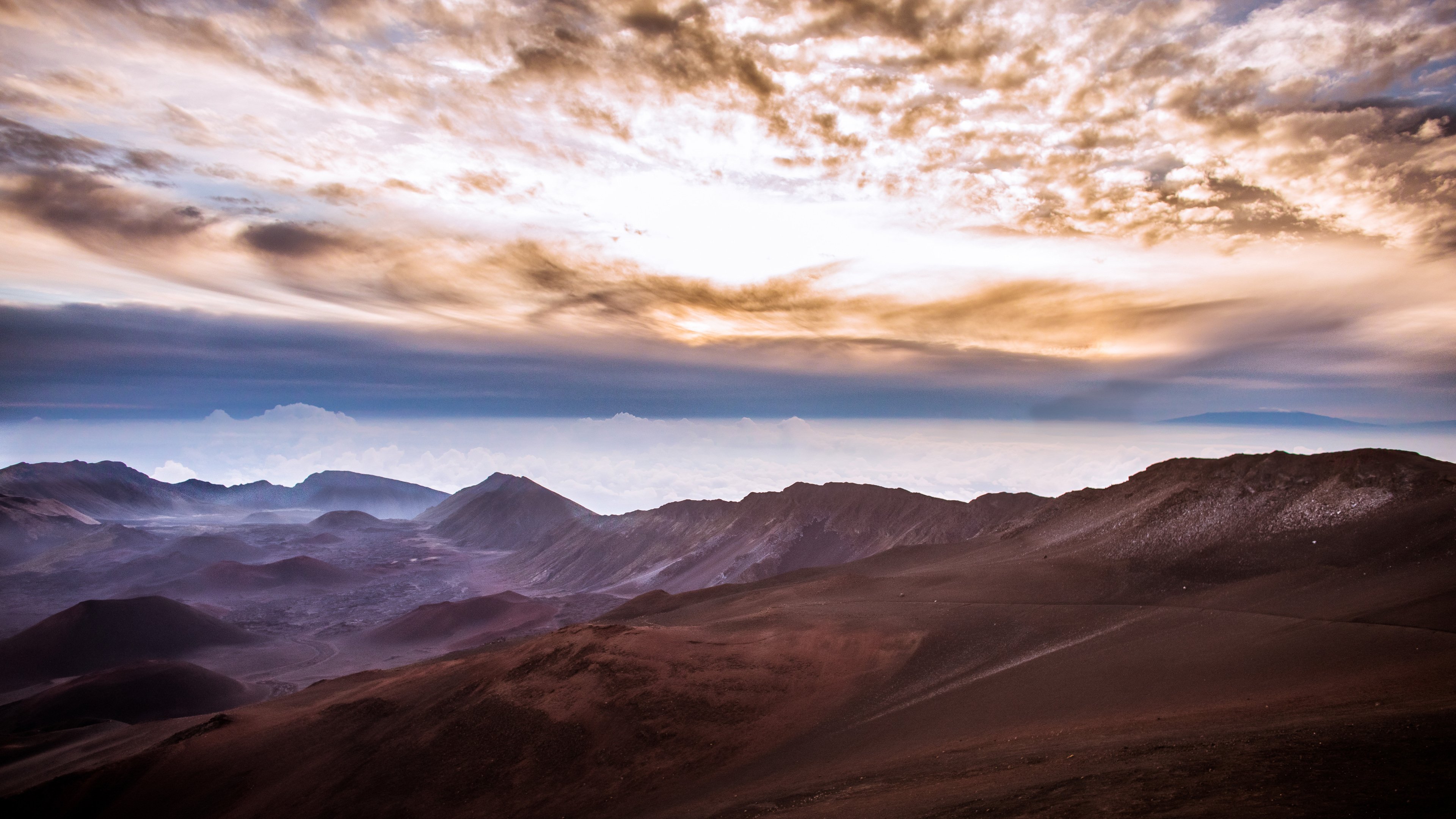 Haleakala, Volcano, Clouds, Sunrise 4K Desktop Wallpaper