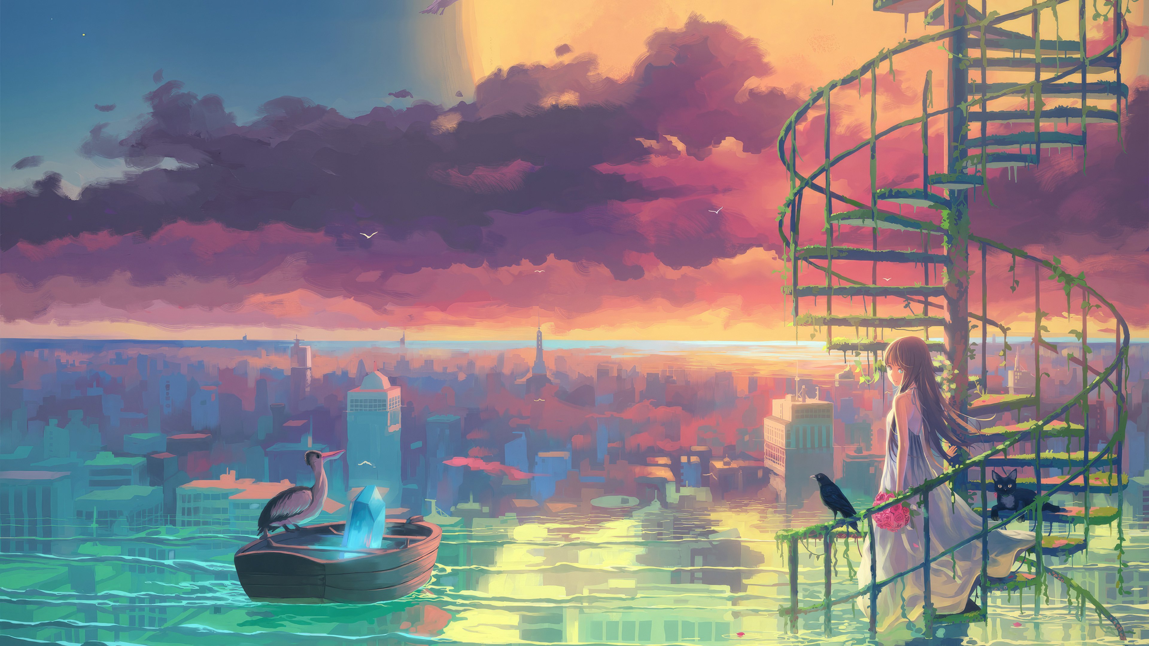 Anime, Cityscape, Staircase, Sunset 4K Desktop Wallpaper