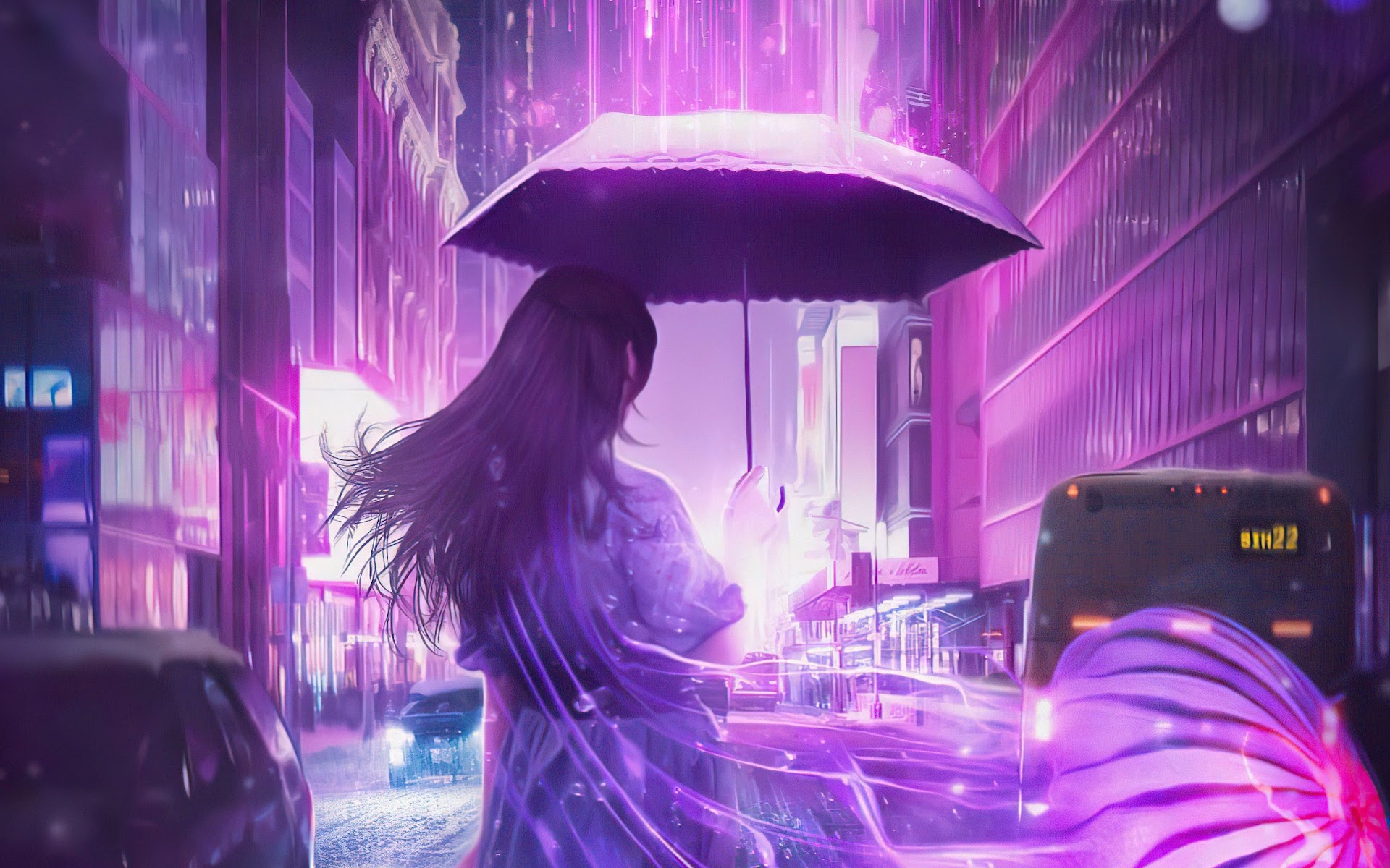 Cyberpunk, Rainy, Umbrella, Purple 4K Desktop Wallpaper Background with a maximum resolution of 3840x2160 px.