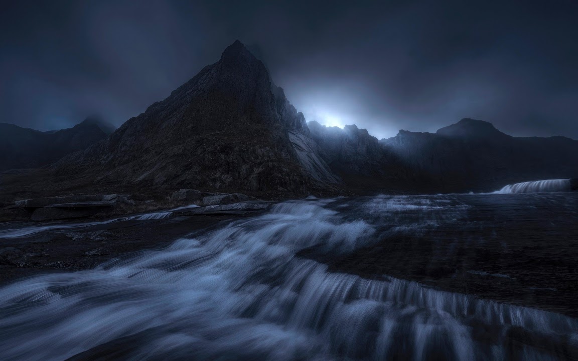 Mountains, Waterfall, Gloomy, Scotland 4K Desktop Wallpaper Background with a maximum resolution of 3840x2160 px.