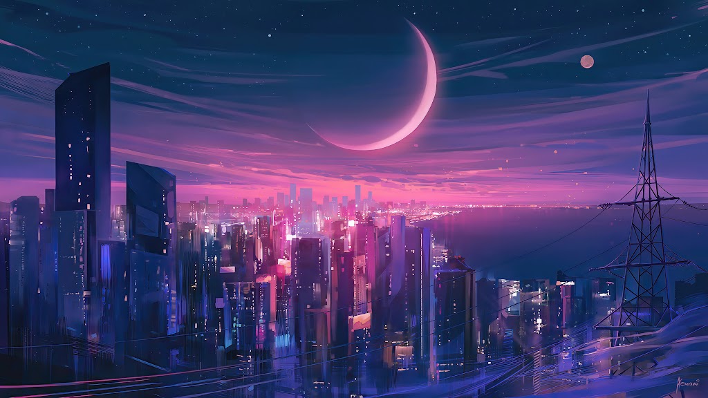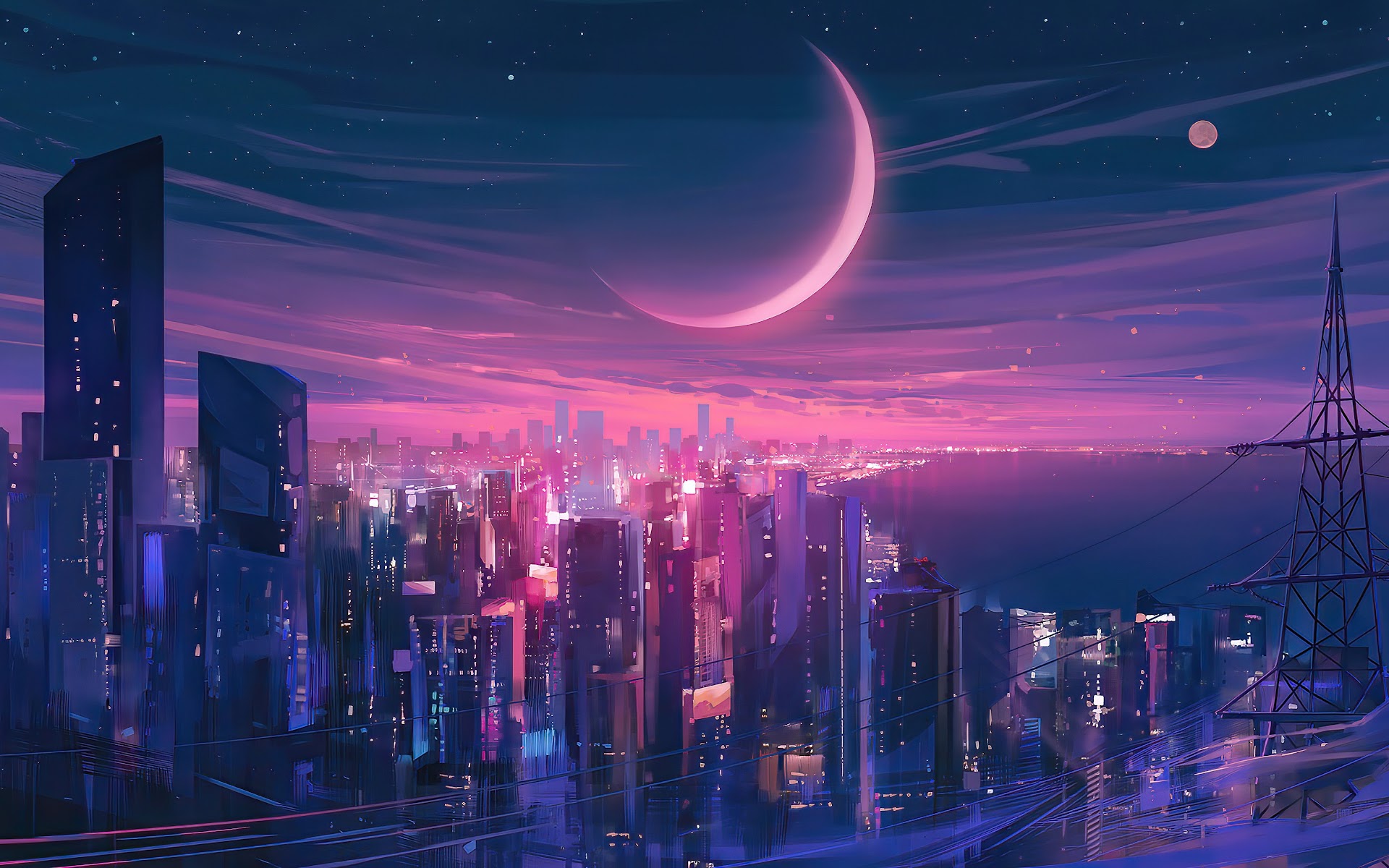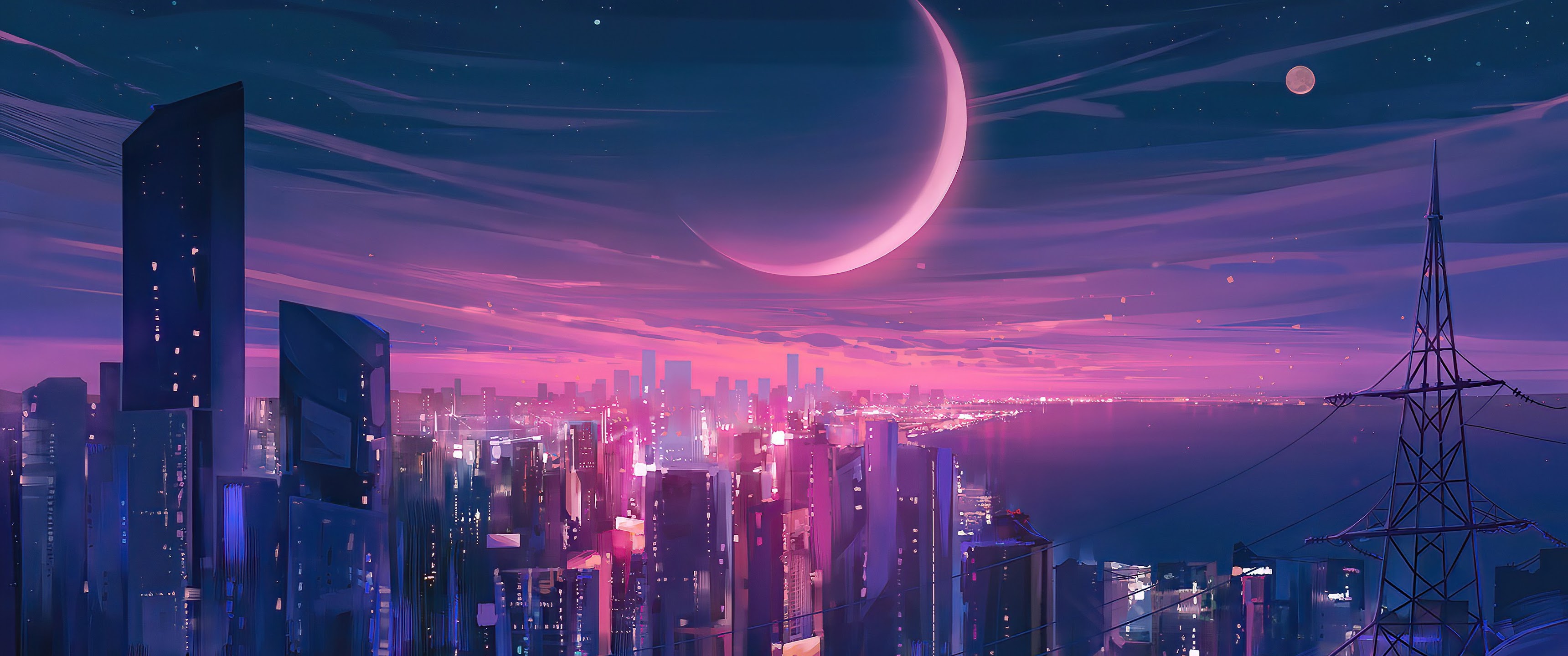 Synthwave, Cityscape, Crescent, Vaporwave 4K Desktop Wallpaper Background with a maximum resolution of 3840x2160 px.
