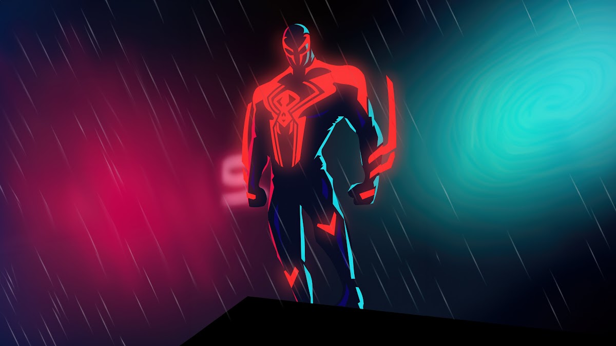 Spiderman, 2099, Neon, Rain, Superhero 4K Desktop Wallpaper Background with a maximum resolution of 3840x2160 px.