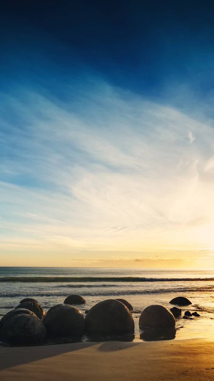 Moeraki, Boulders, Sunrise, Otago, Beach 4K Wallpaper Background with a maximum resolution of 3840x2160 px.