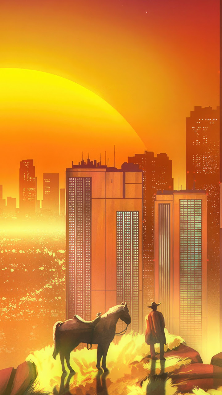 Cyberpunk, Cowboy, Sunset, Skyline 4K Wallpaper Background with a maximum resolution of 3840x2160 px.