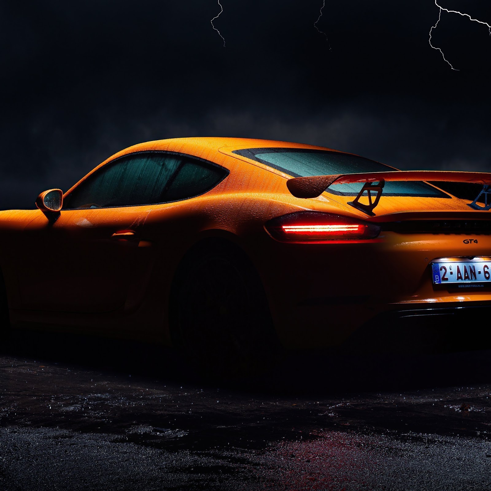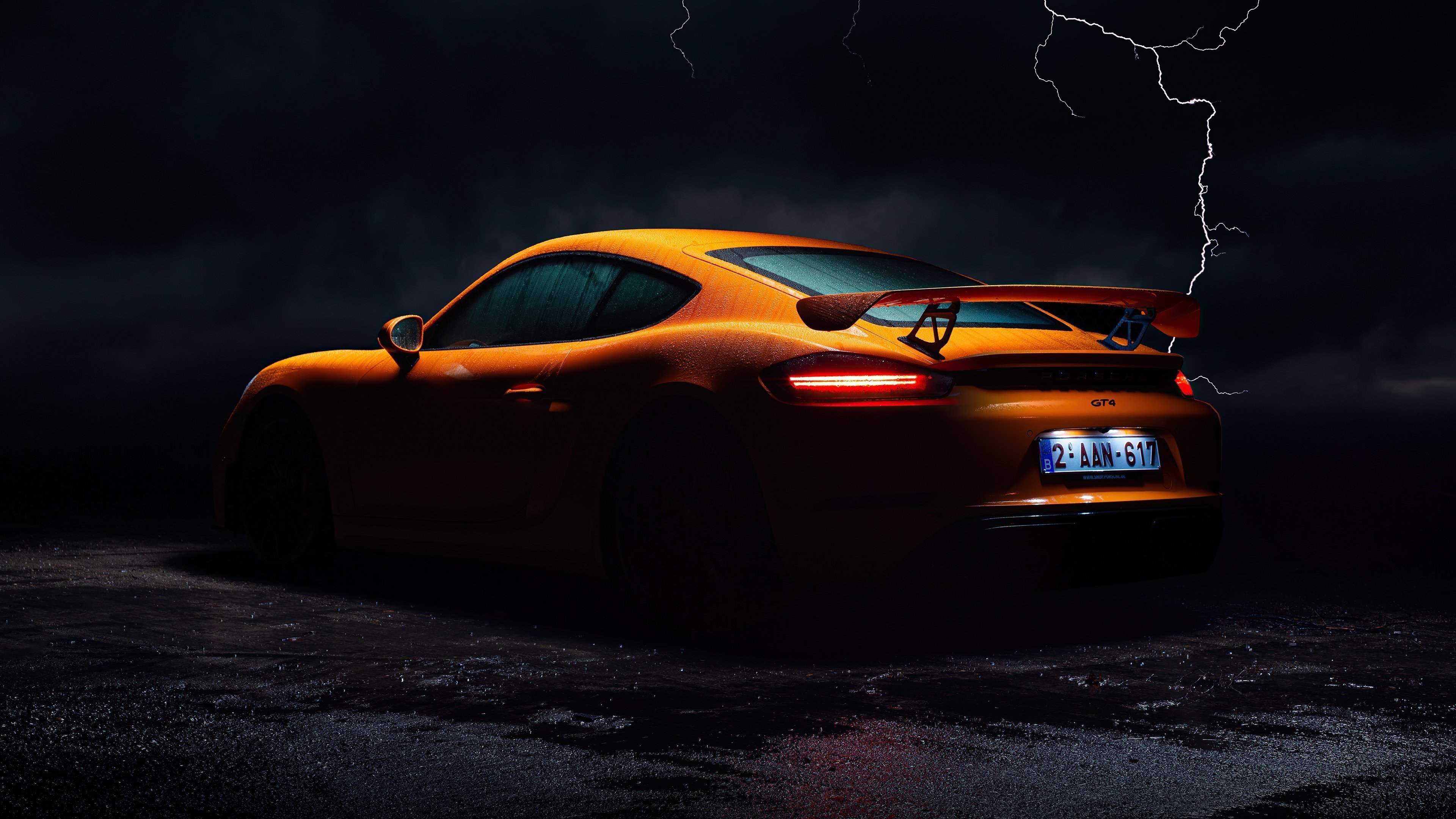 Porsche, Gt4, Lightning, Orange, Wet 4K Desktop and Mobile Wallpaper Background with a maximum resolution of 3840x2160 px.