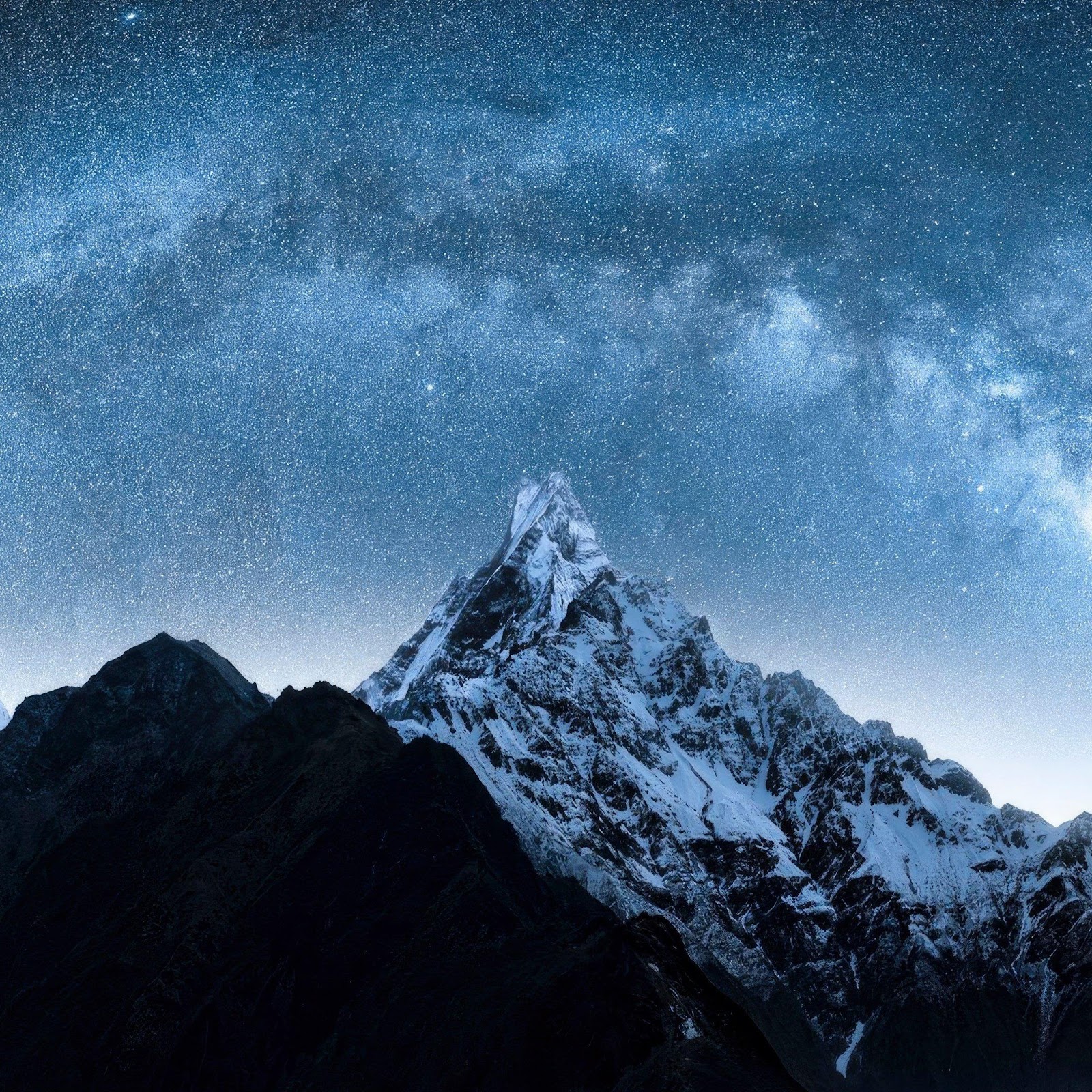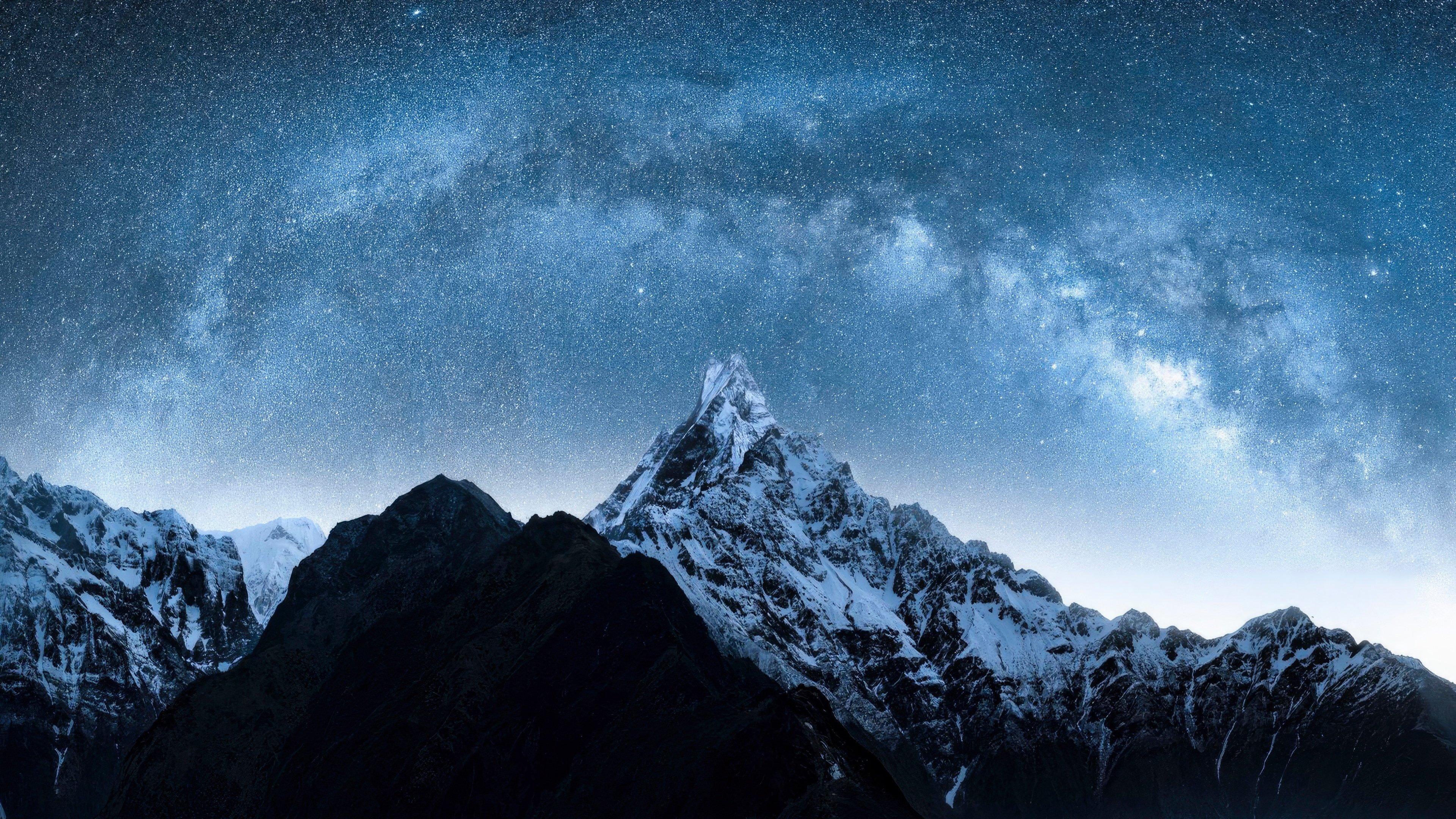 Mountains, Milky Way, Stargazing, Snow Peak 4K Wallpaper Background with a maximum resolution of 3840x2160 px.