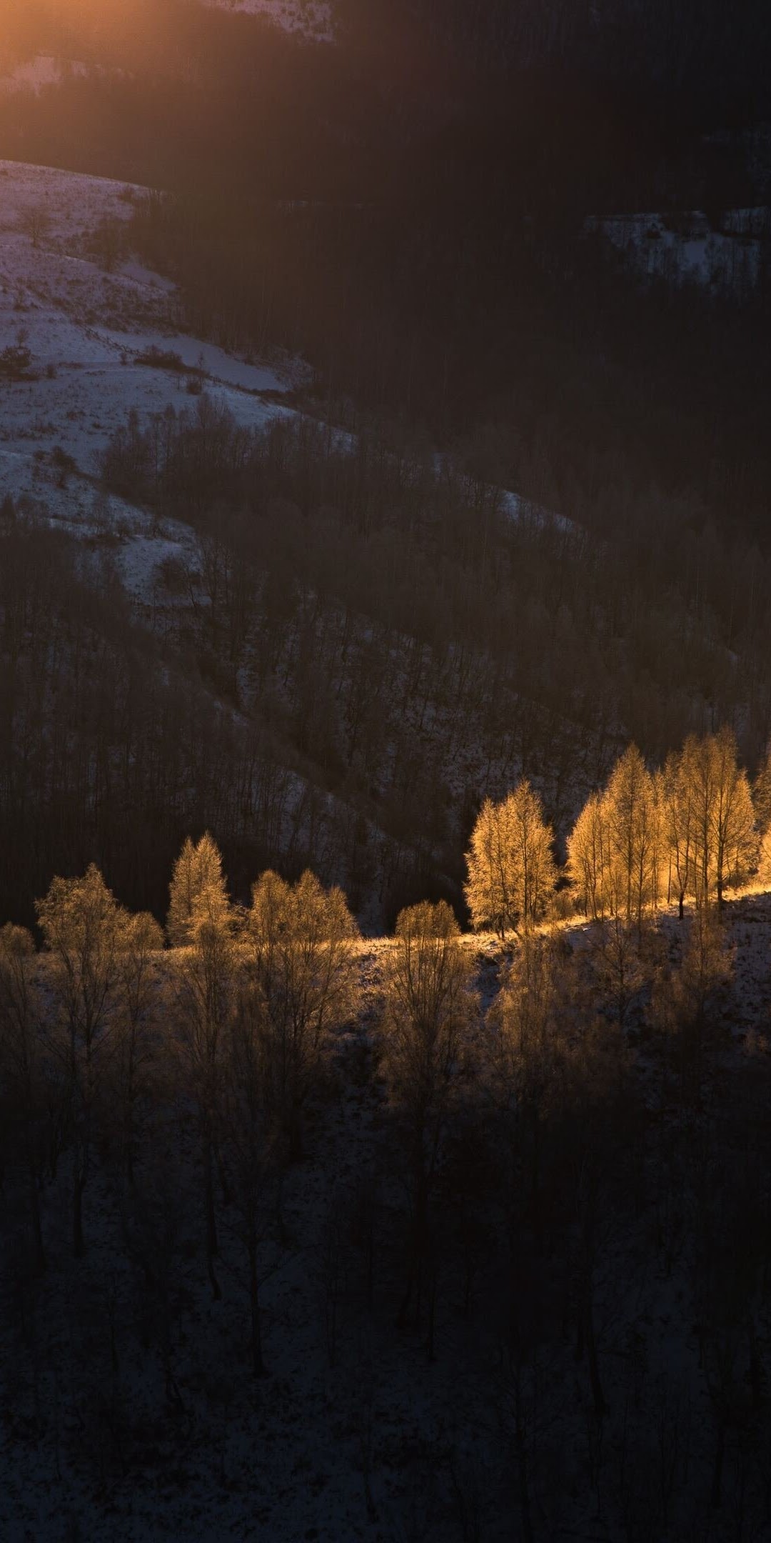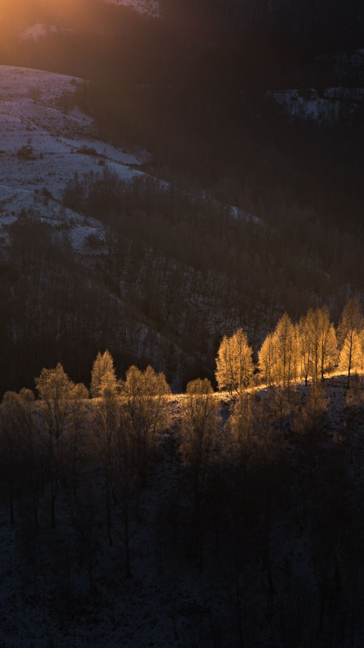 Sun Beams With Golden Light Over The Frozen Trees Nature 4K Phone Wallpaper