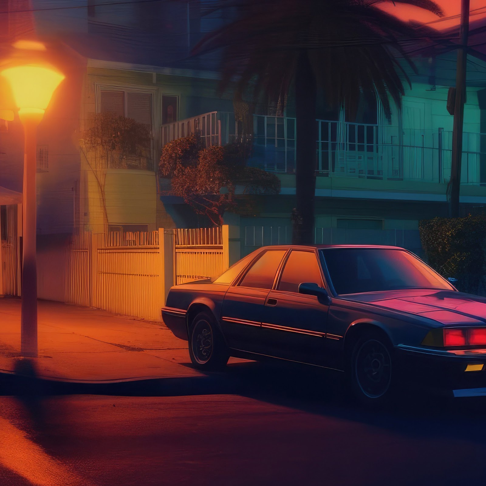 Retrowave, Car, Palm, Cityscape, Night 4K Wallpaper Background with a maximum resolution of 3840x2160 px.