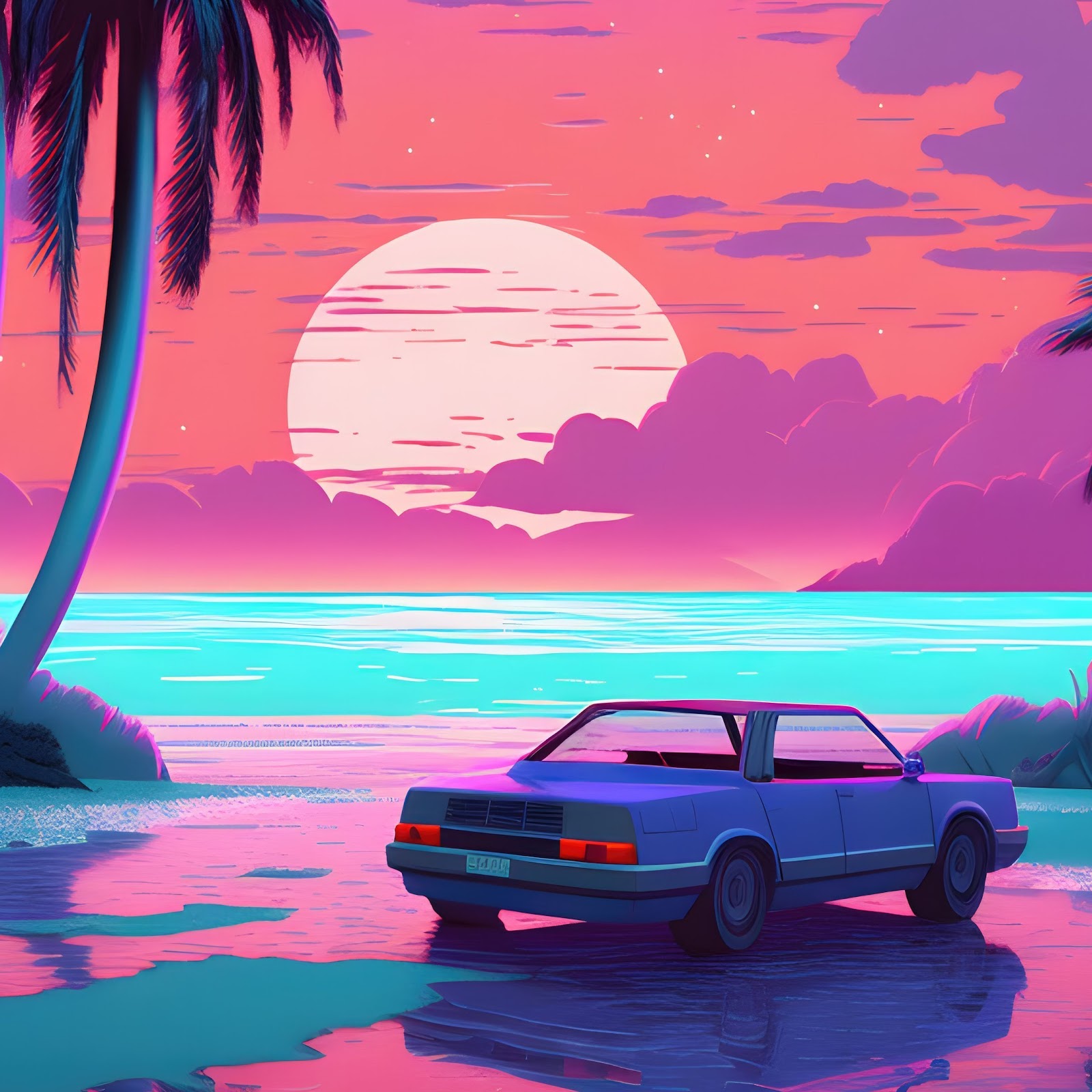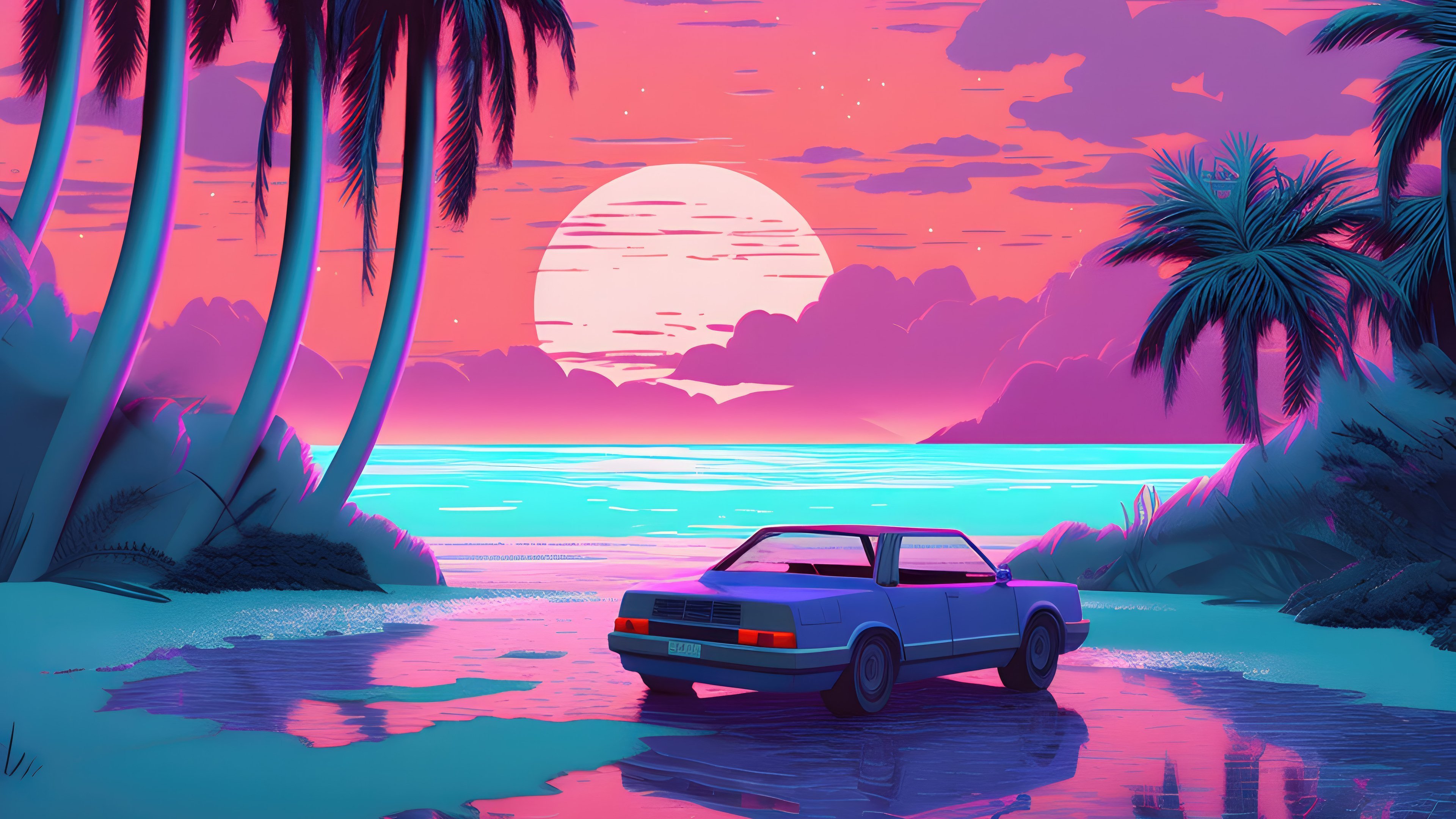 Vaporwave, Retrowave, Car, Sunset, Palms 4K Desktop and Mobile Wallpaper Background with a maximum resolution of 3840x2160 px.