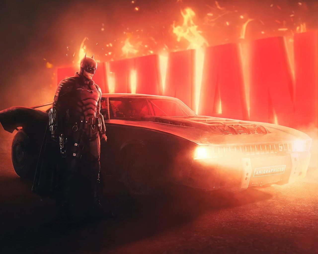 Batman, Batmobile, Red, Fire, Movie 4K Phone Wallpaper