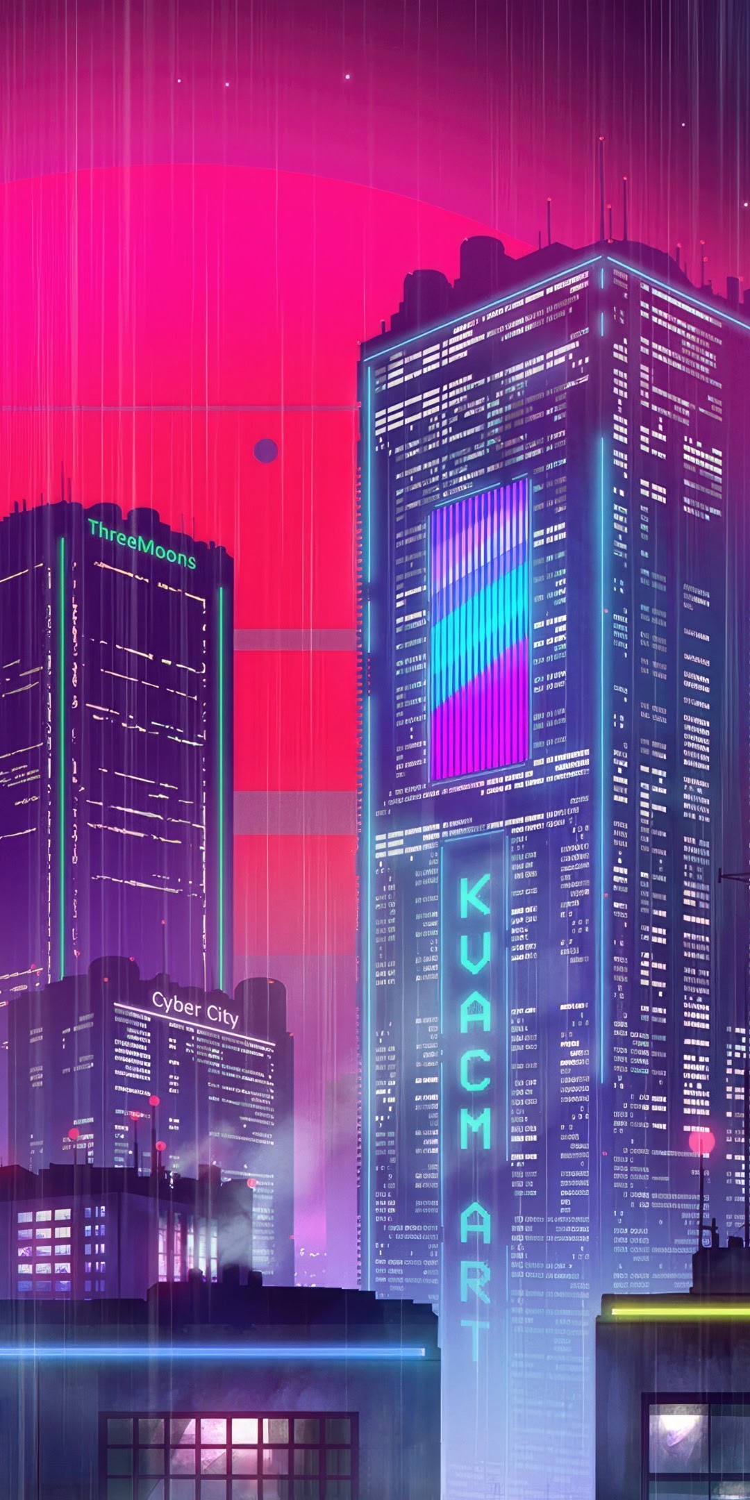 Three Mesmerizing Moons Illuminate The Futuristic Cityscape 4K Phone Wallpaper