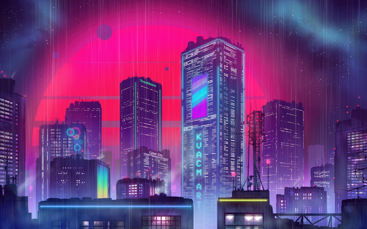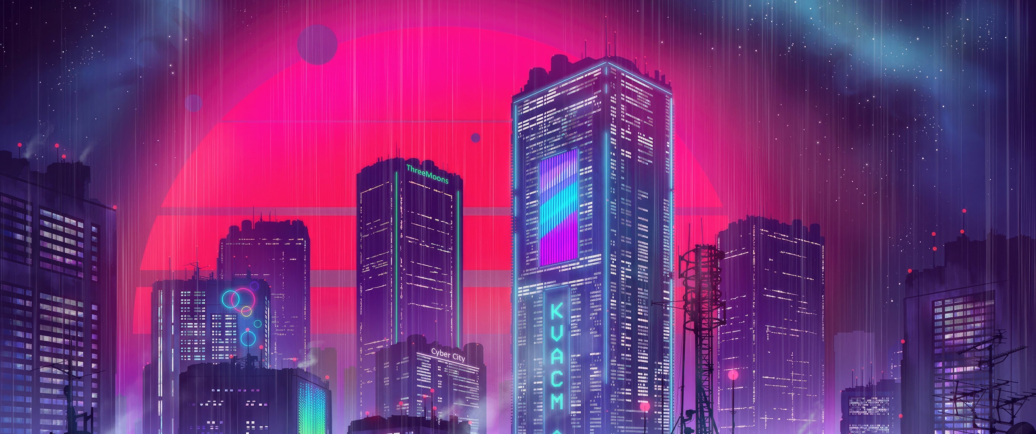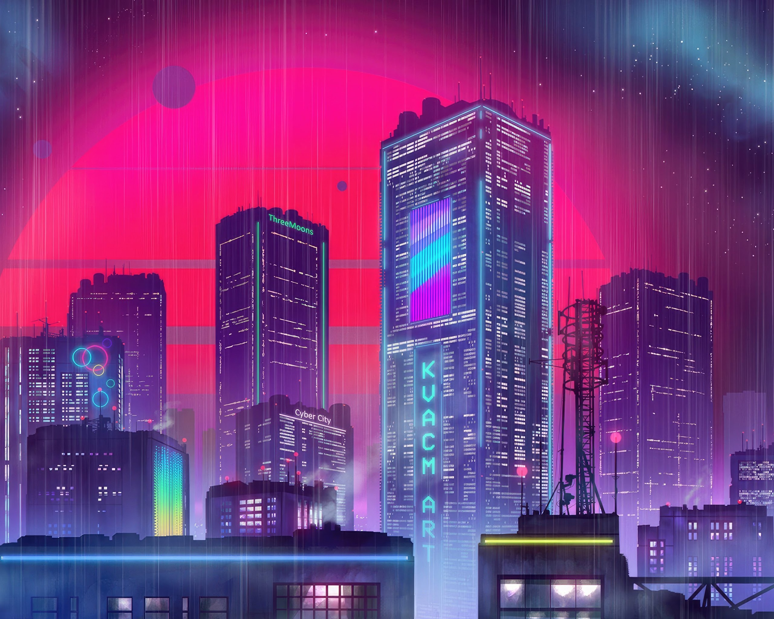 Three Mesmerizing Moons Illuminate The Futuristic Cityscape 4K Desktop Wallpaper Background with a maximum resolution of 3840x2160 px.