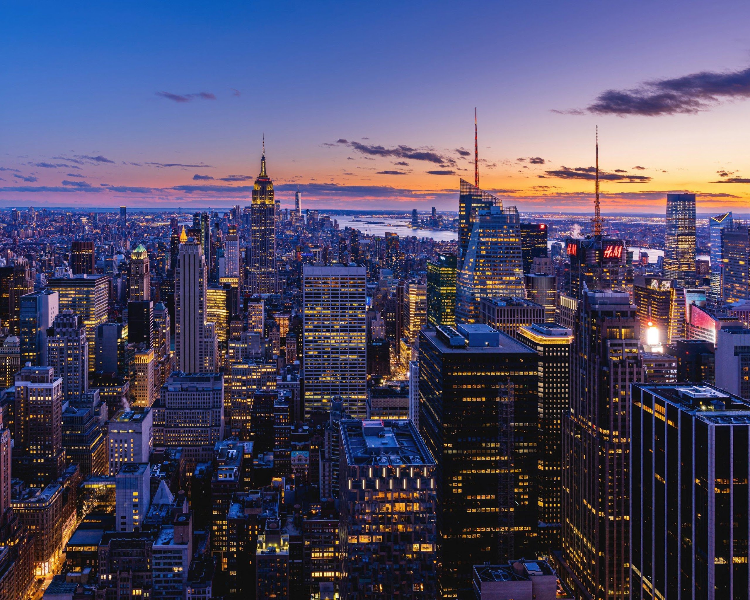 Manhattan, Skyline, Sunset, Skyscraper 4K Desktop Wallpaper Background with a maximum resolution of 3840x2160 px.