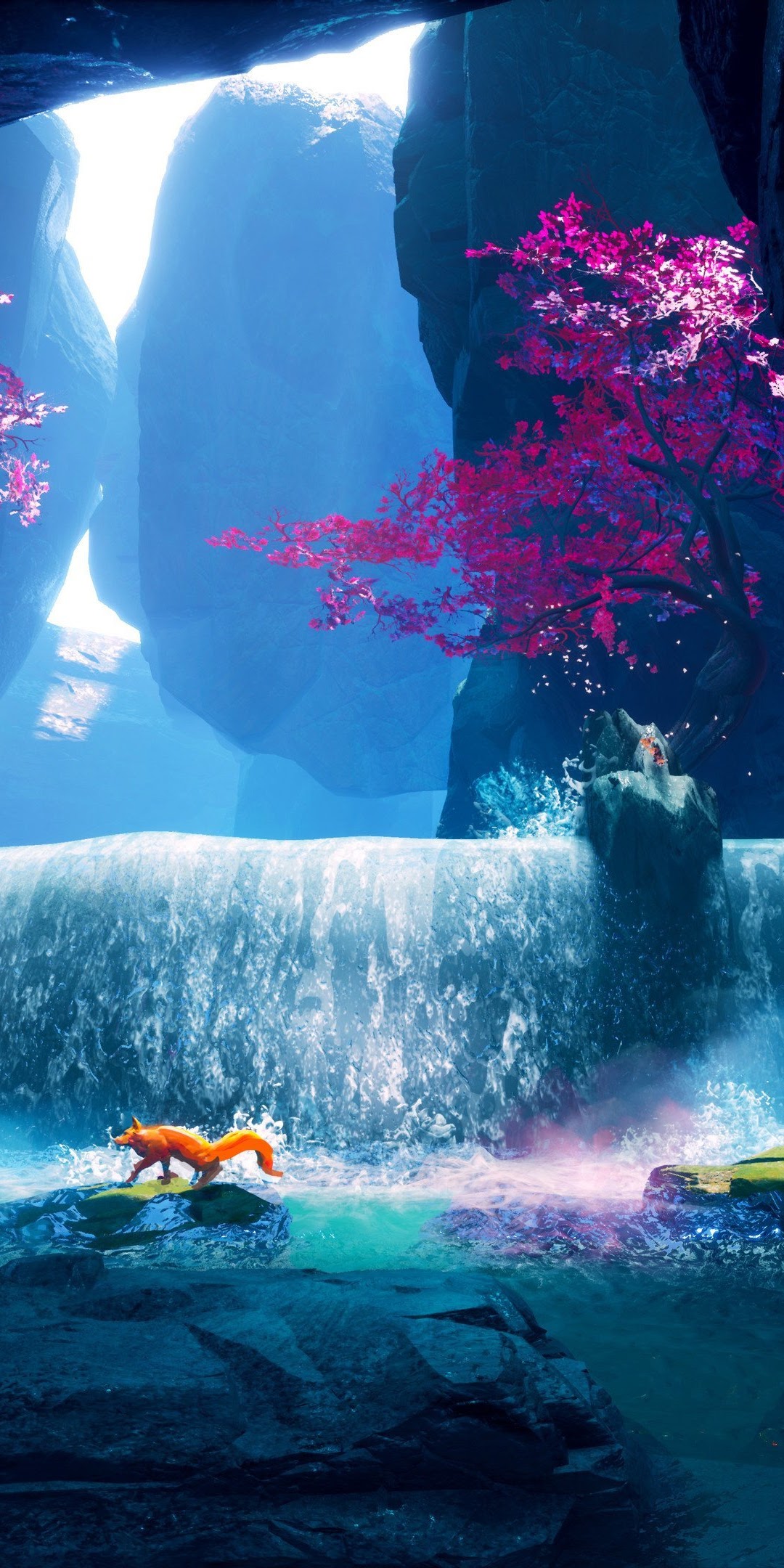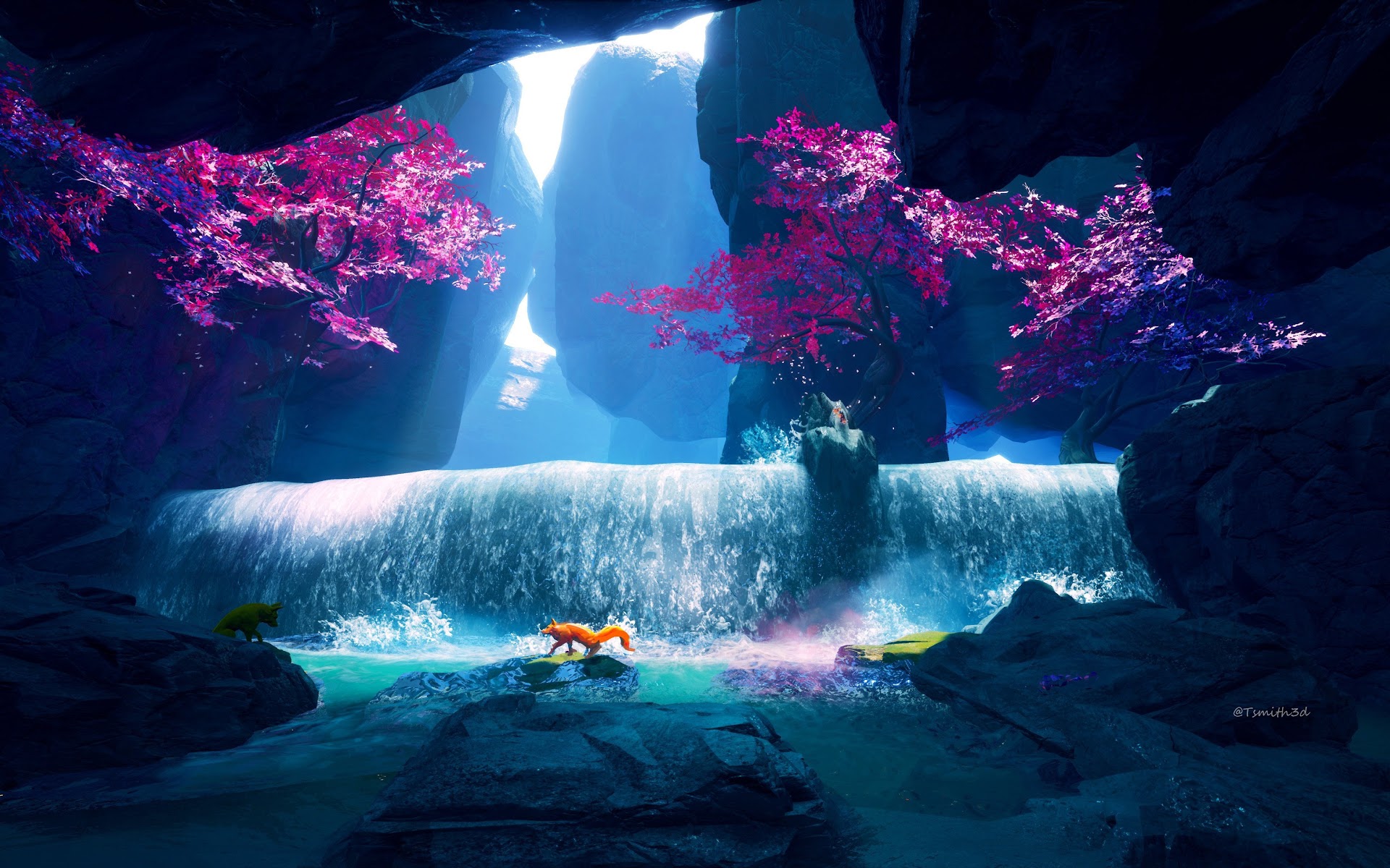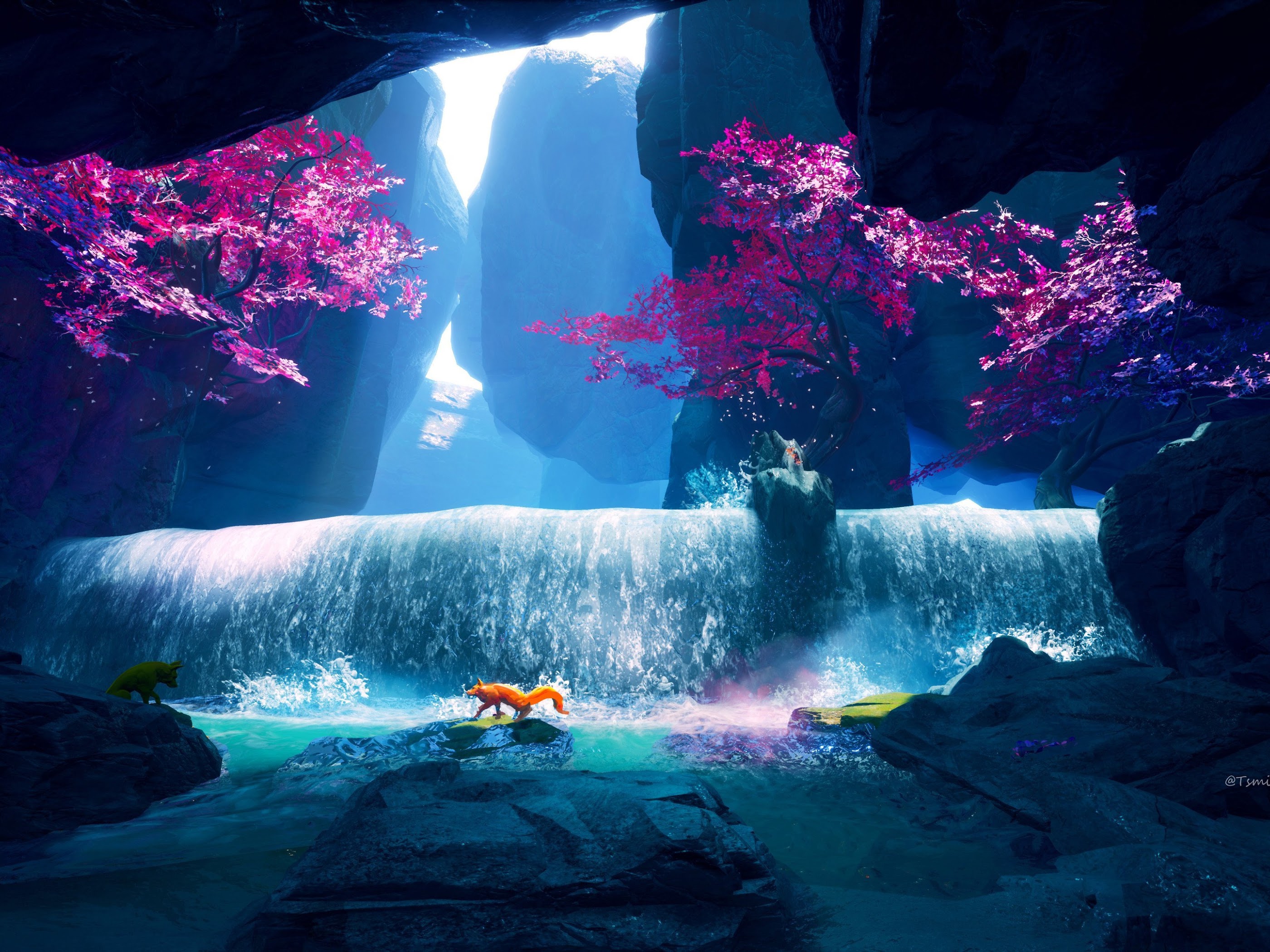 Waterfall, Fox, Water, Trees, Splashes 4K Desktop Wallpaper Background (3840x2160) Free Download