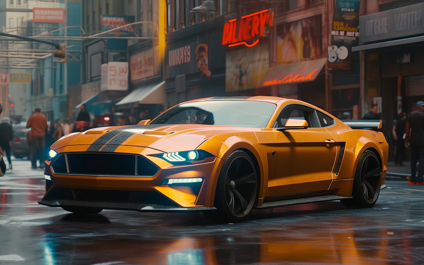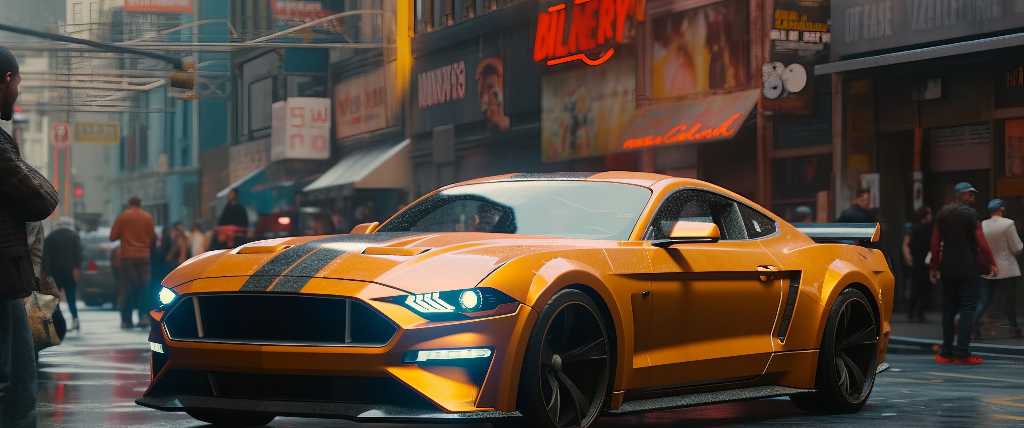 Ai Art, Ford, Orange, Sports Car, Street 2K Desktop and Mobile Wallpaper Background with a maximum resolution of 2912x1632 px.