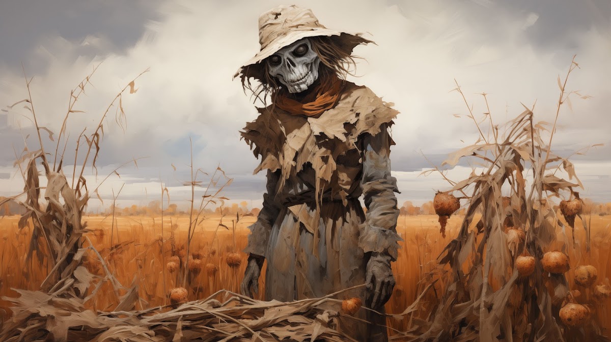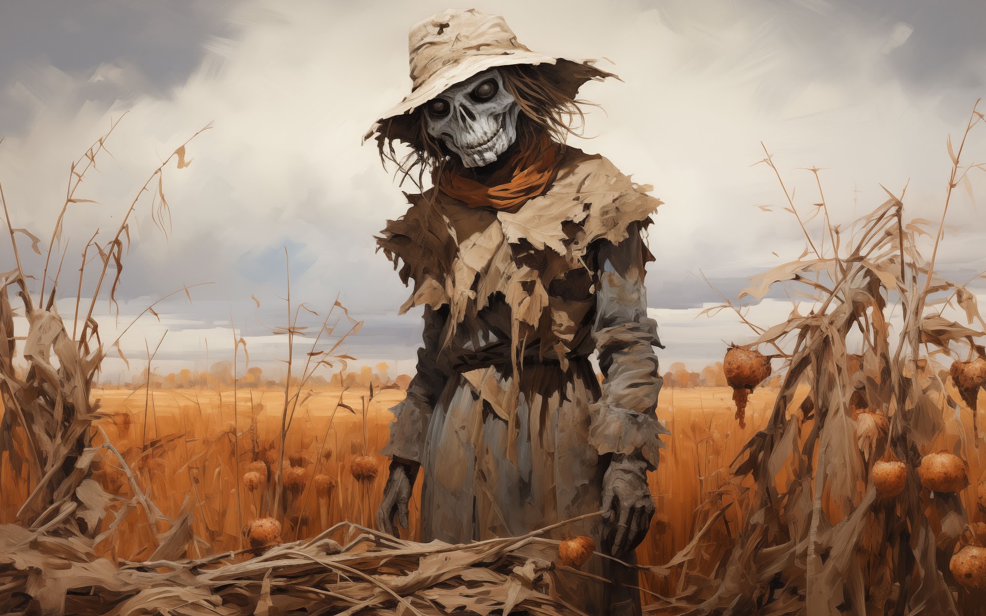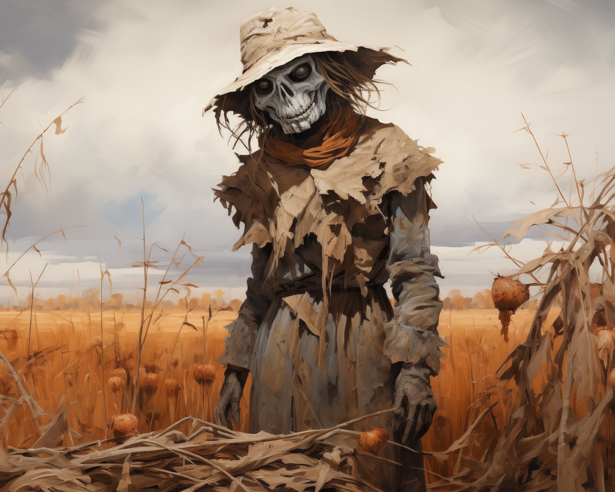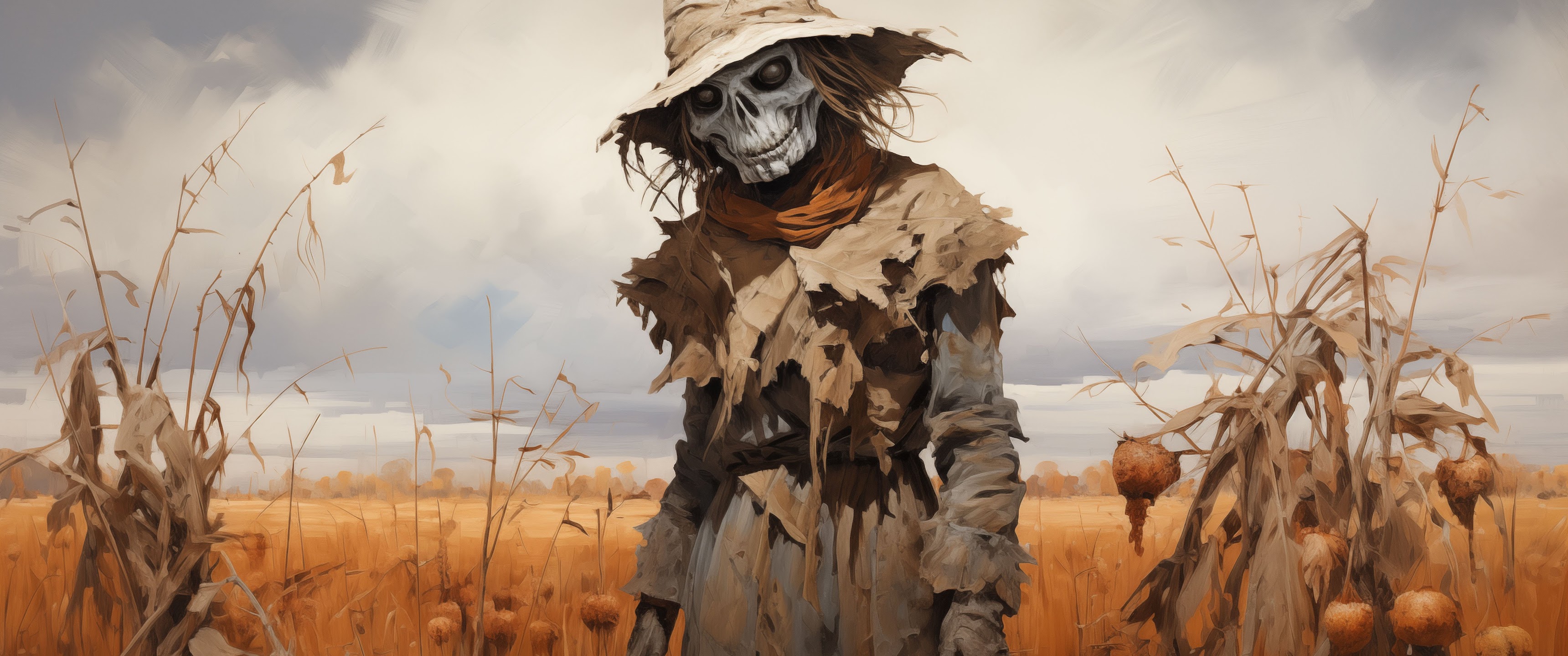 Ai Art, Orange, Scarecrows, Hat, Field 5K Desktop and Mobile Wallpaper Background with a maximum resolution of 5824x3264 px.