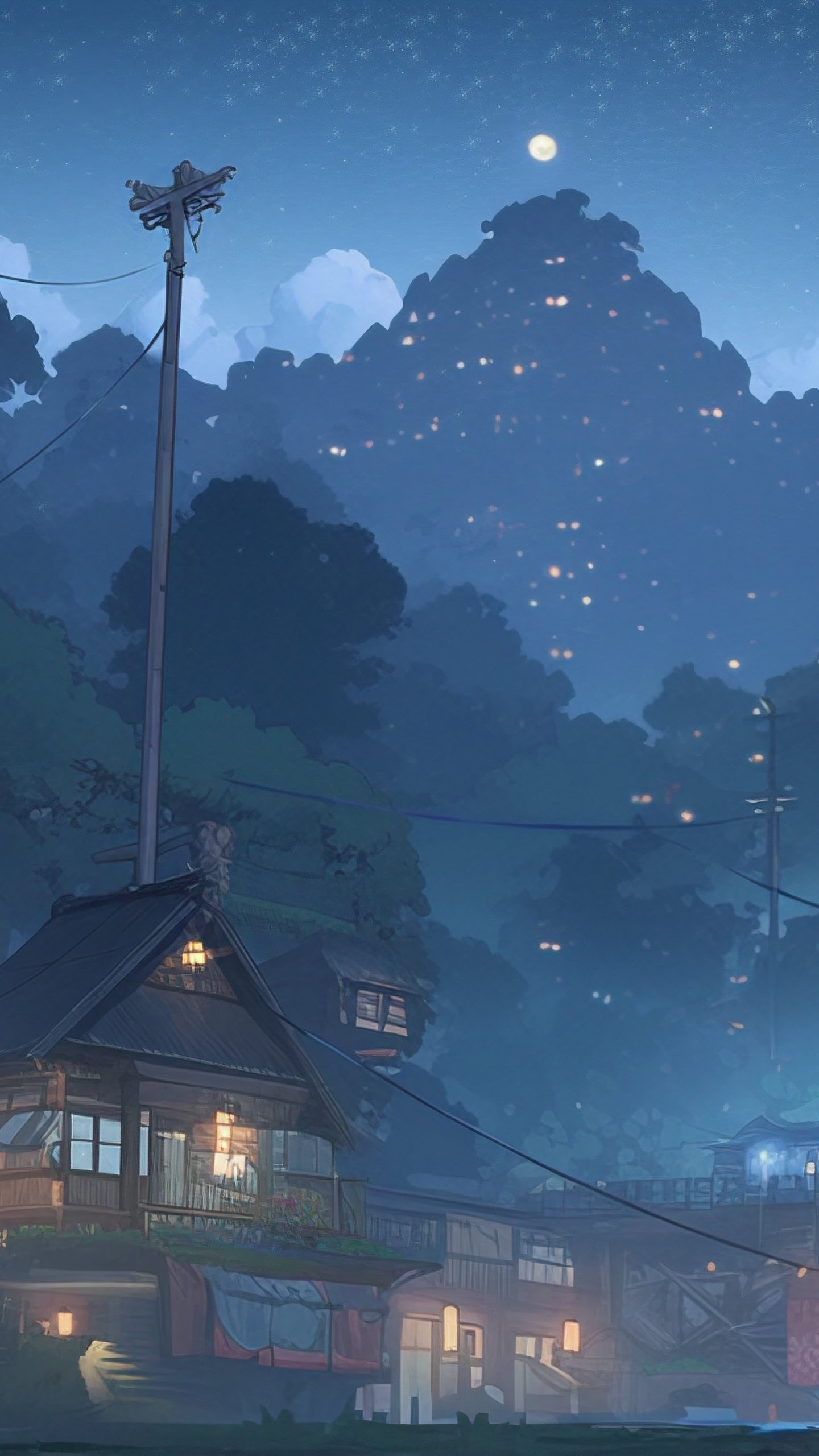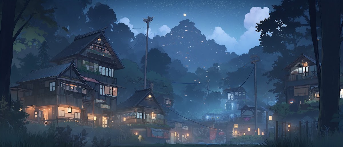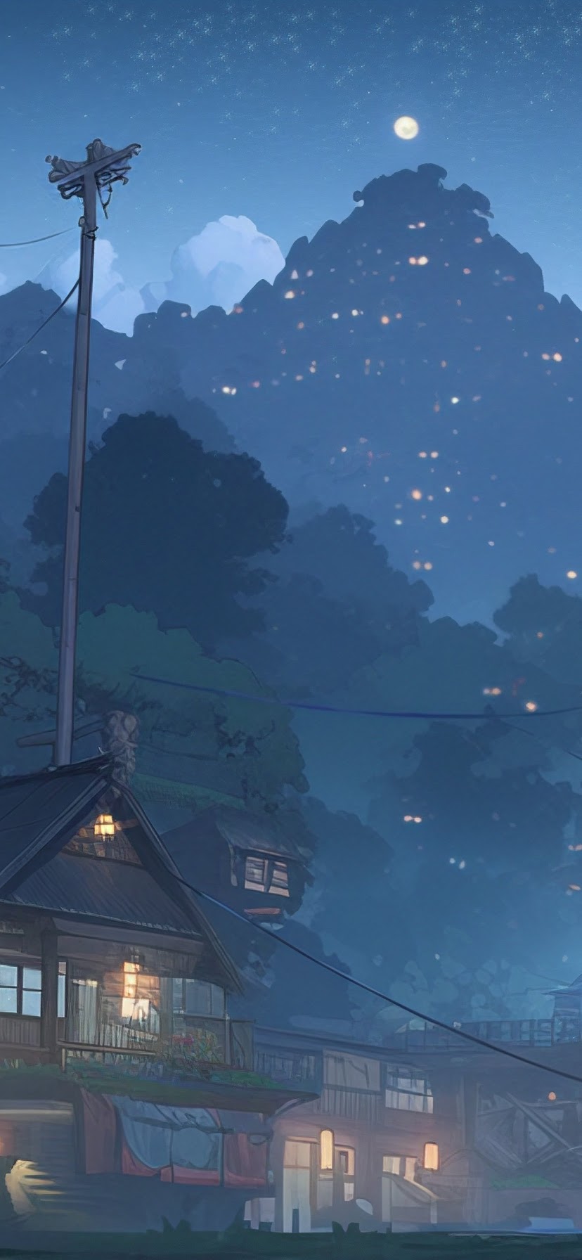 Ai Art, Village, Night, Building, Clouds 5K Desktop and Mobile Wallpaper Background with a maximum resolution of 6720x2880 px.
