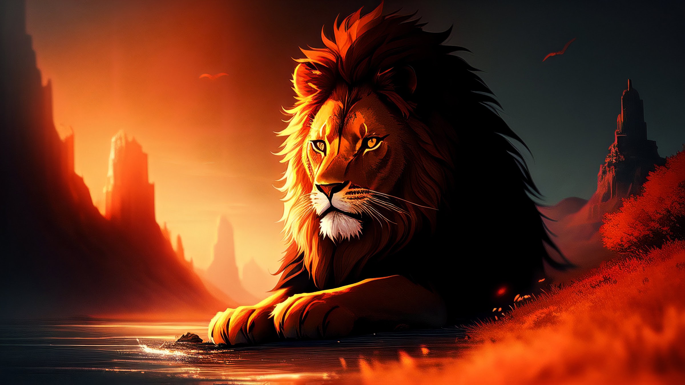 Lion, Sunset, Landscape, Orange 4K Desktop Wallpaper