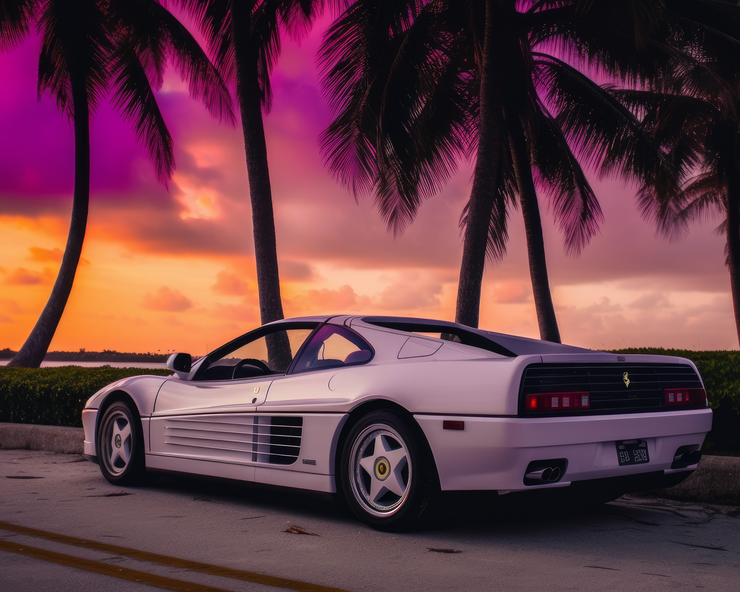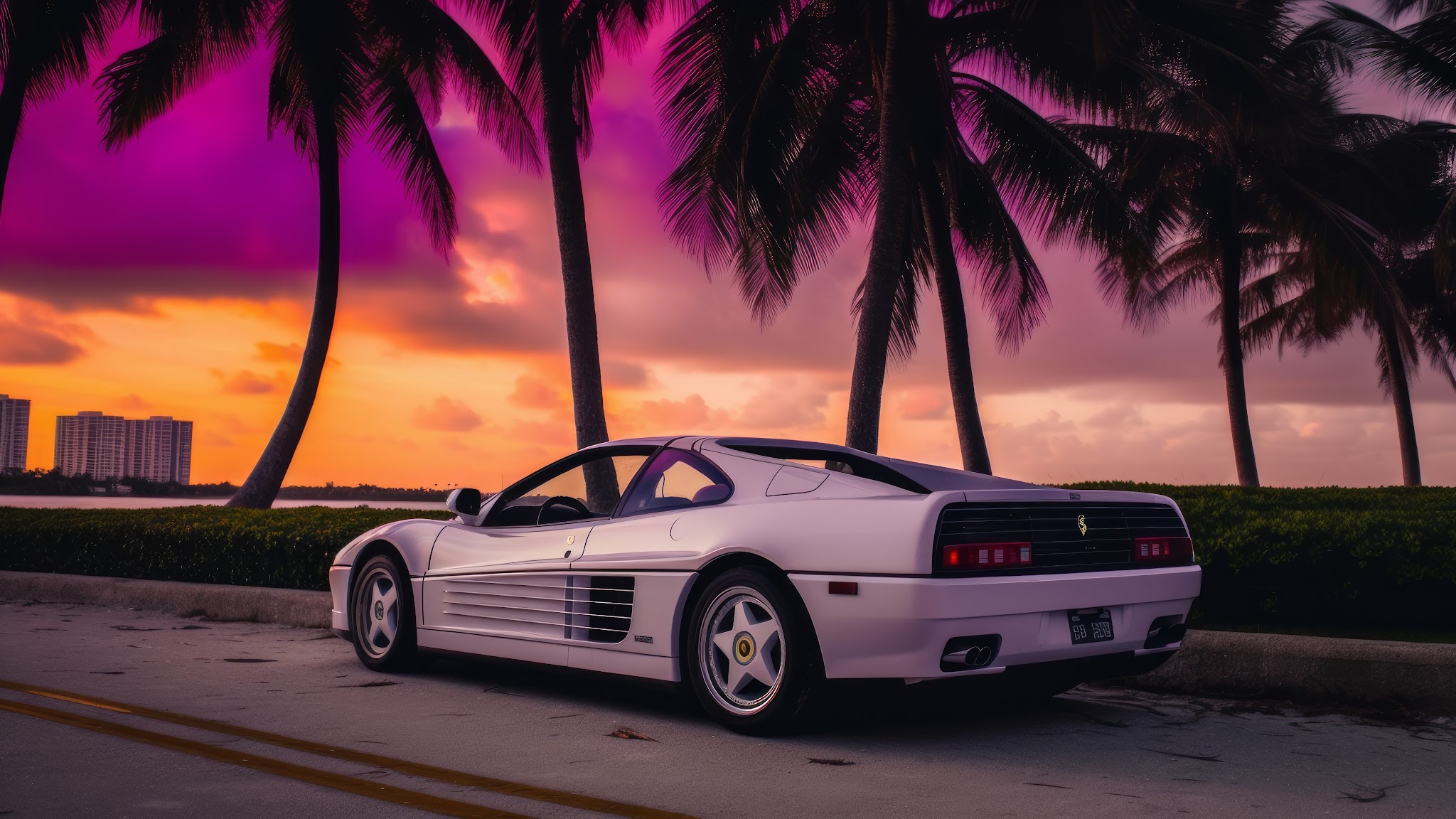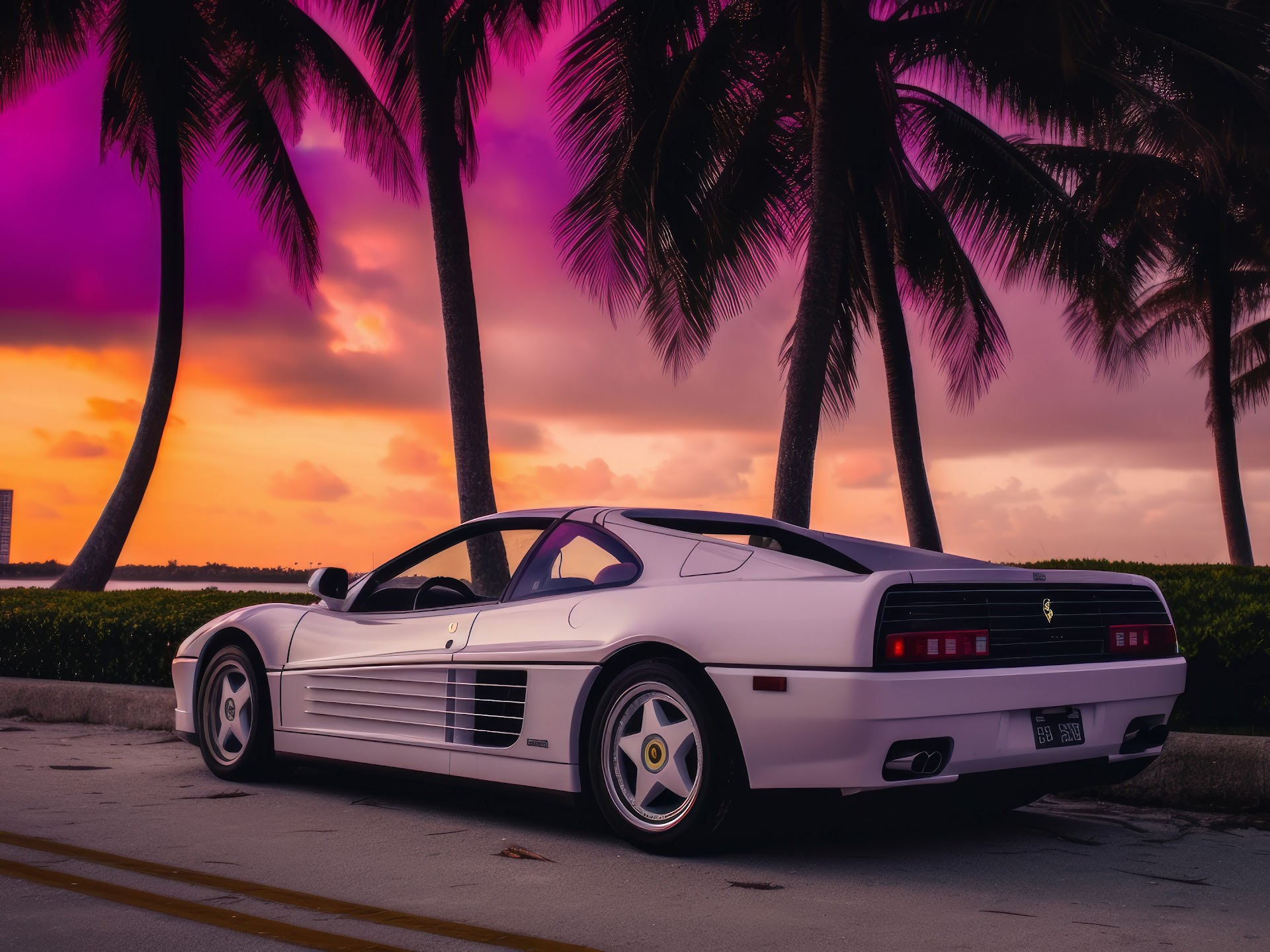 A Stunning Ai Art, Ferrari Testarossa, Palm Trees, Sunset, Sports Car 4K Desktop and Mobile Wallpaper Background (3854x2160)