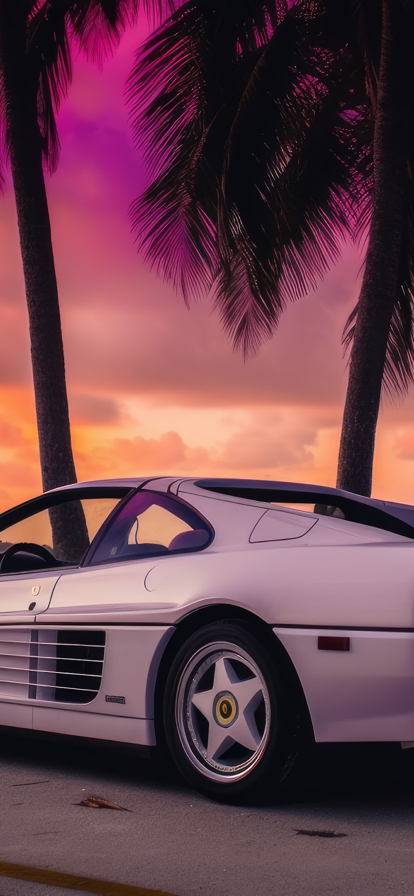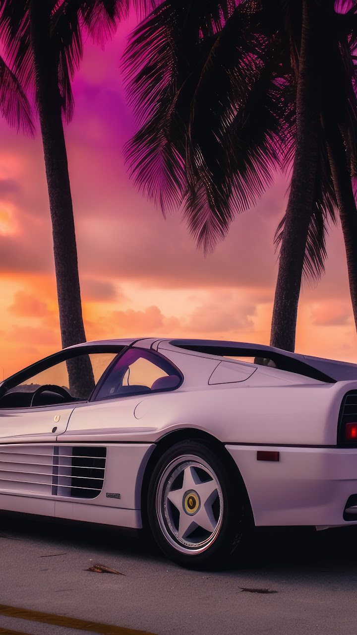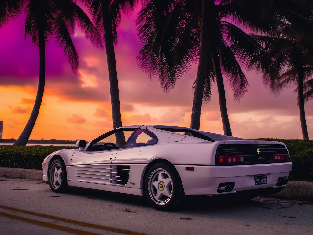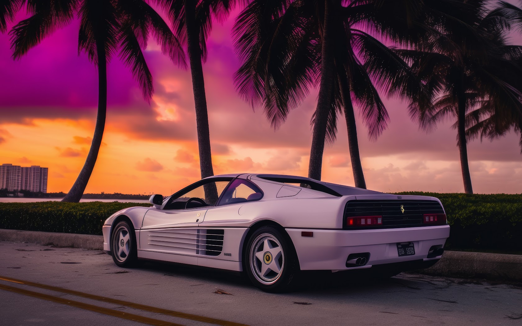A Stunning Ai Art, Ferrari Testarossa, Palm Trees, Sunset, Sports Car 4K Desktop and Mobile Wallpaper Background (3854x2160)