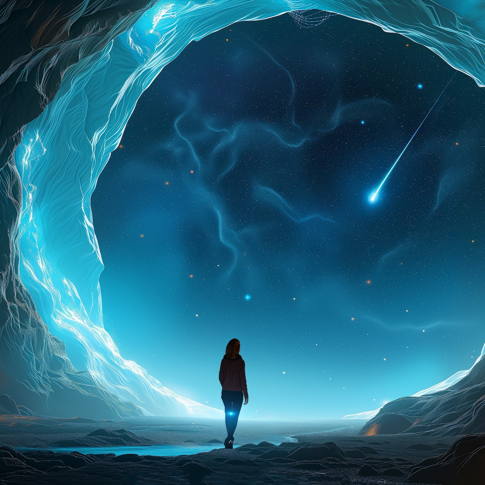 Ai Art, Illustration, Ice Cave, Shooting Stars, Women 5K Phone Wallpaper
