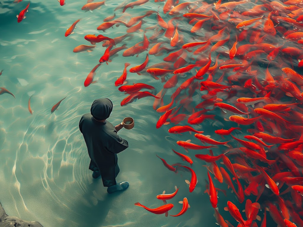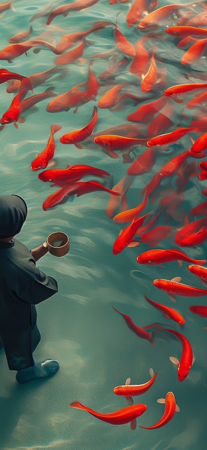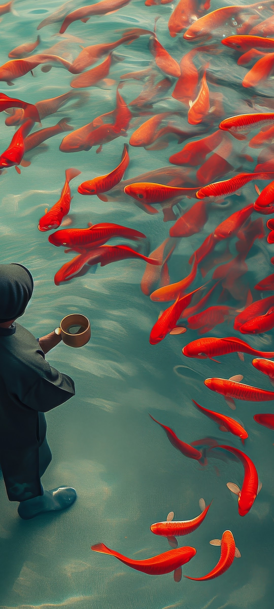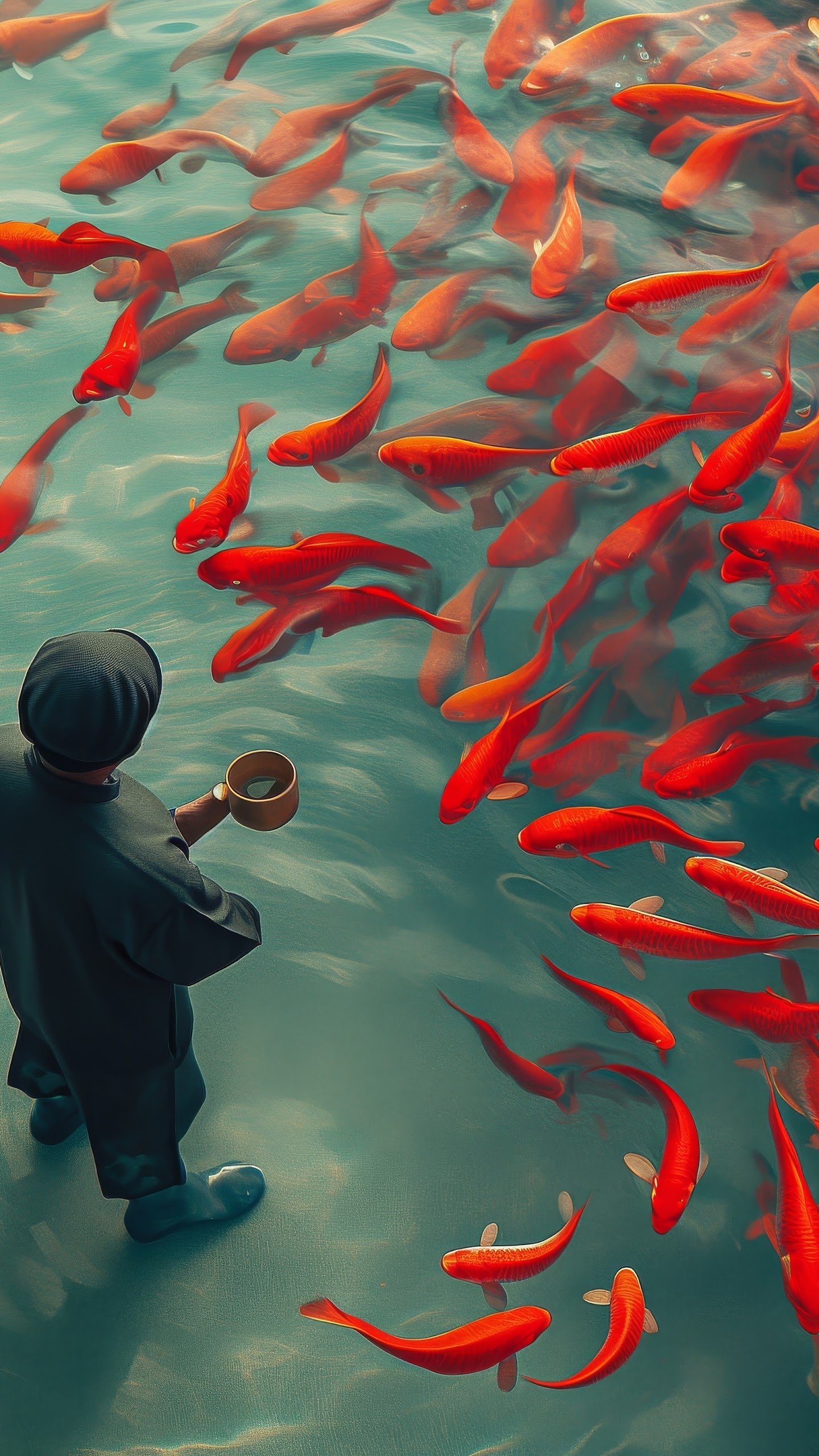 A Stunning Ai Art, Illustration, Koi Fish, Men, Standing 5K Desktop and Mobile Wallpaper Background (5824x3264)