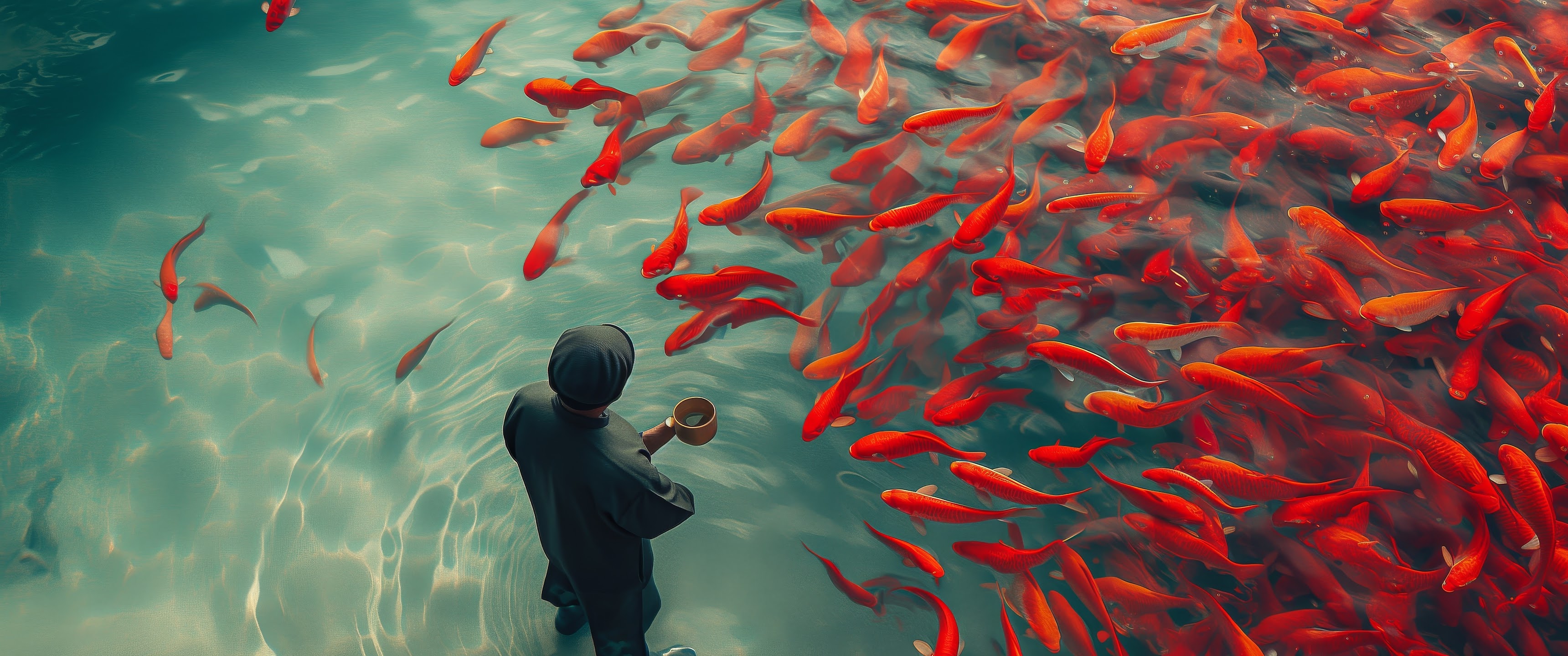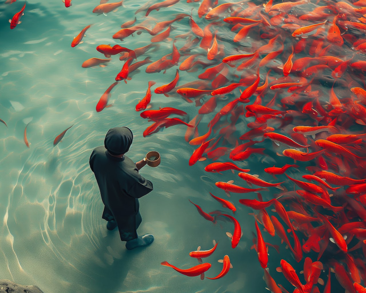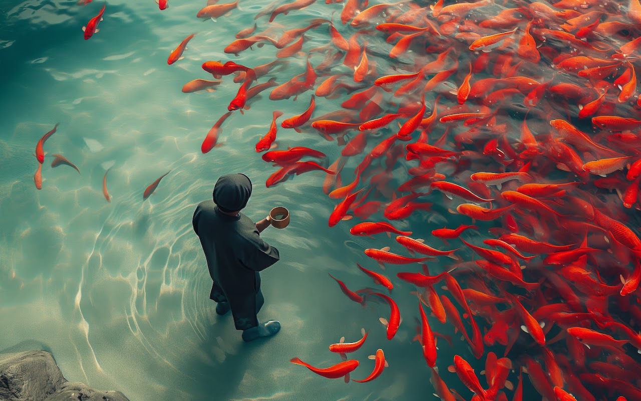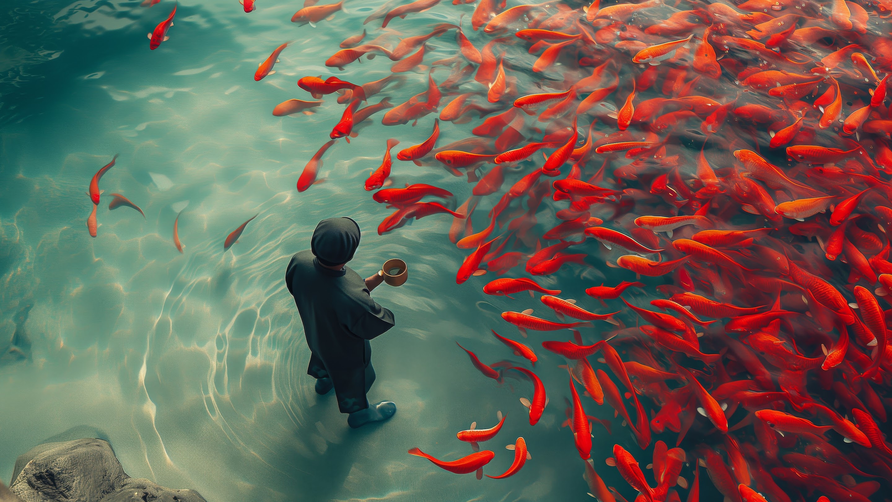 A Stunning Ai Art, Illustration, Koi Fish, Men, Standing 5K Desktop and Mobile Wallpaper Background (5824x3264)