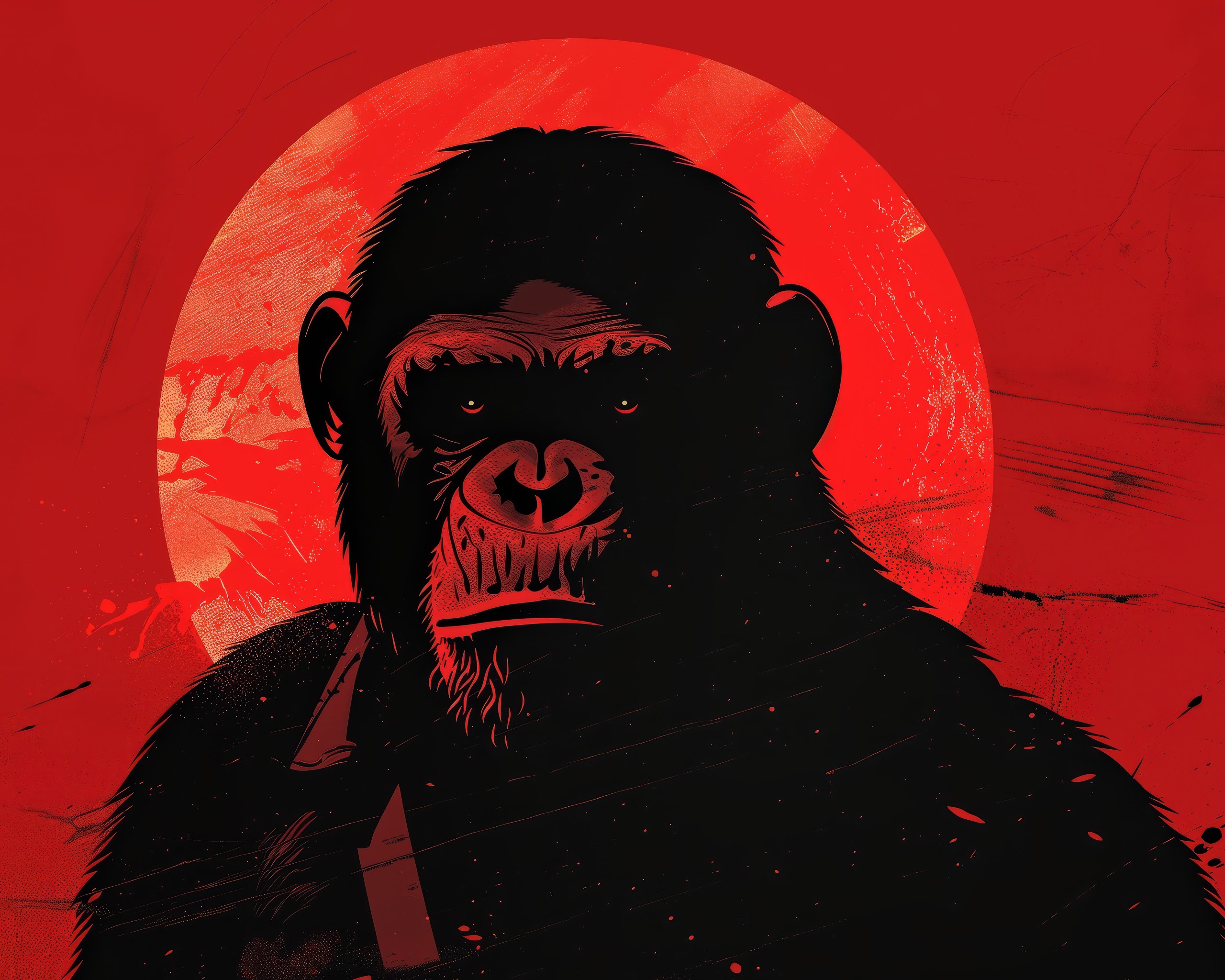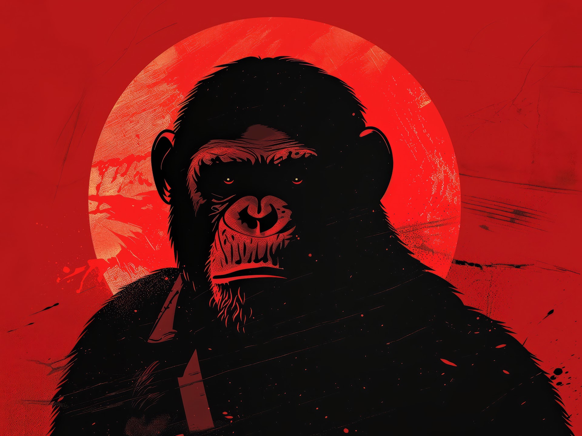 Ai Art, Illustration, Planet Of The Apes, Ape, Red 5K Desktop and Mobile Wallpaper Background with a maximum resolution of 5824x3264 px.