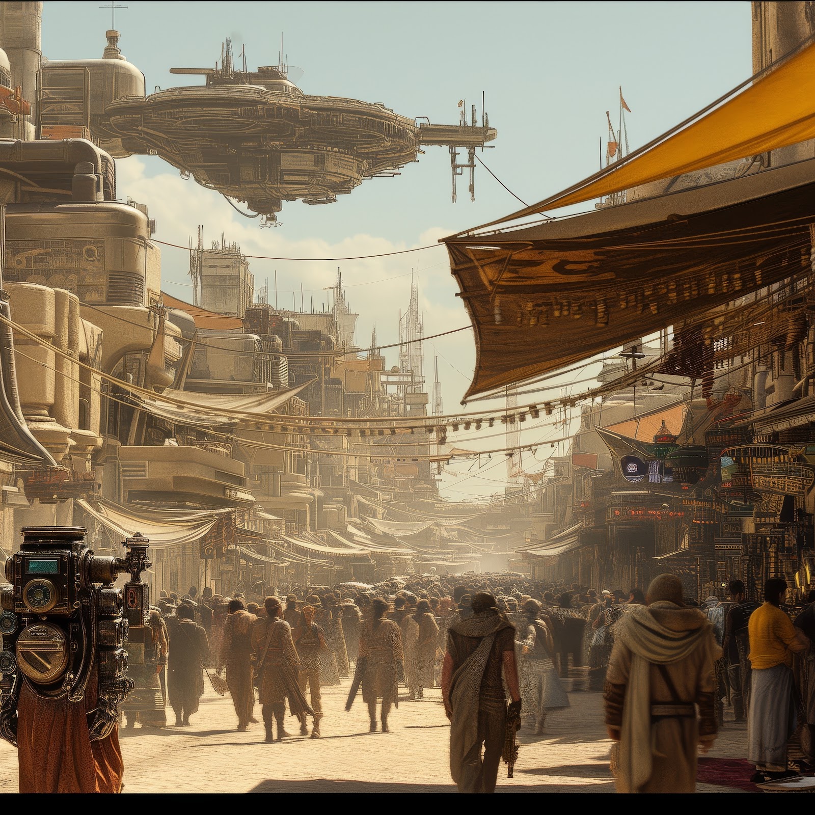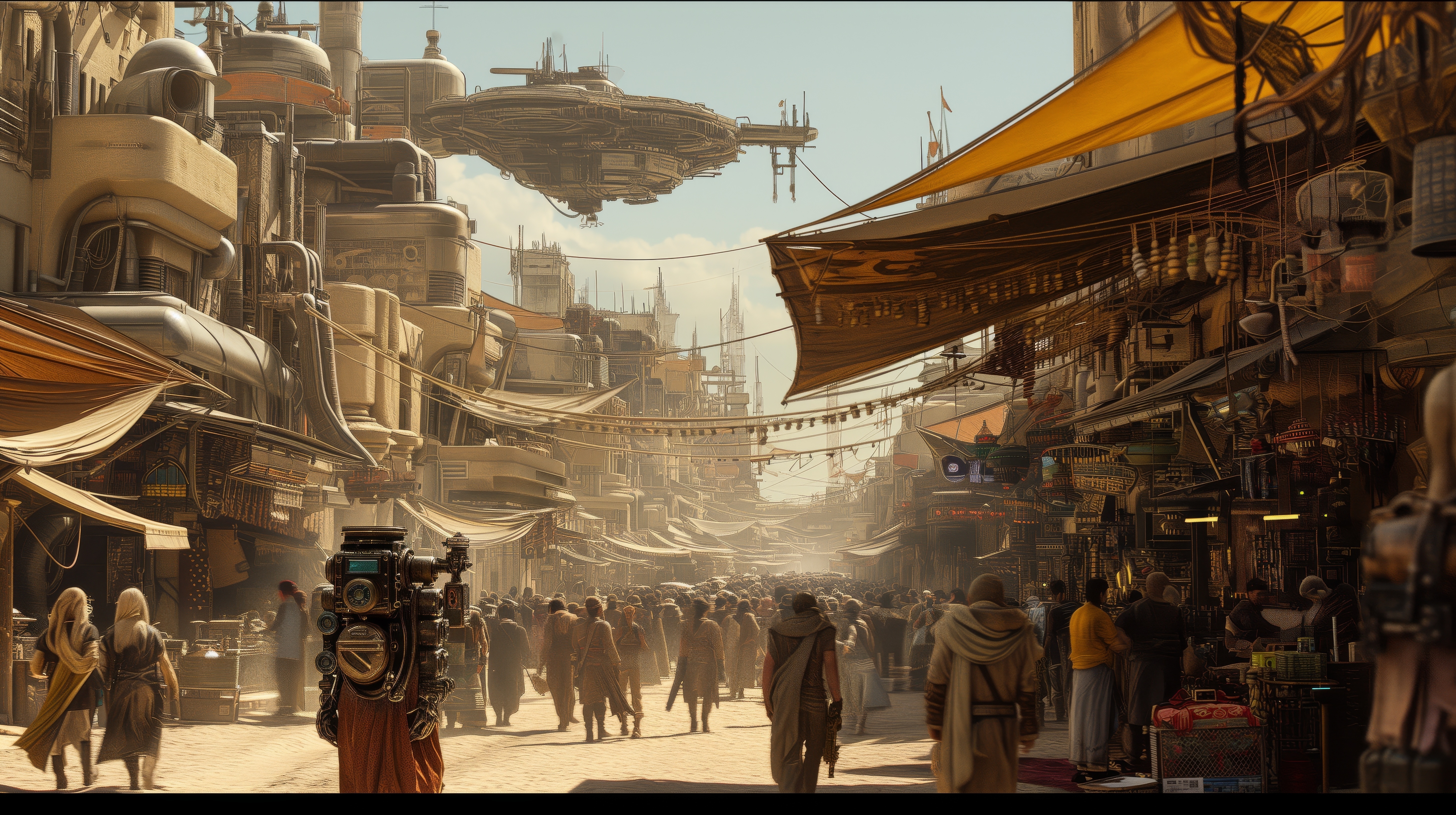 Ai Art, Illustration, Science Fiction, Market Street, City 5K Desktop Wallpaper