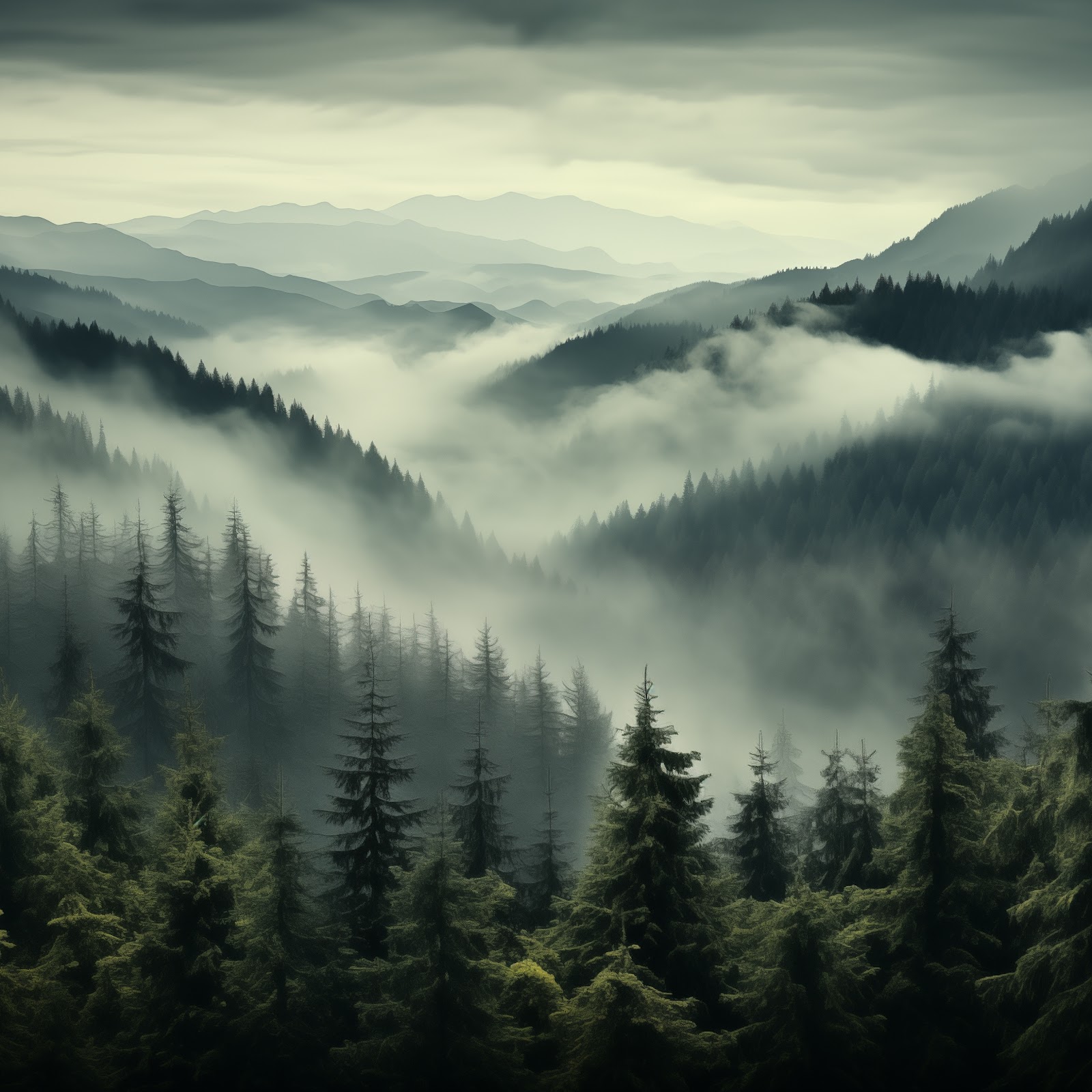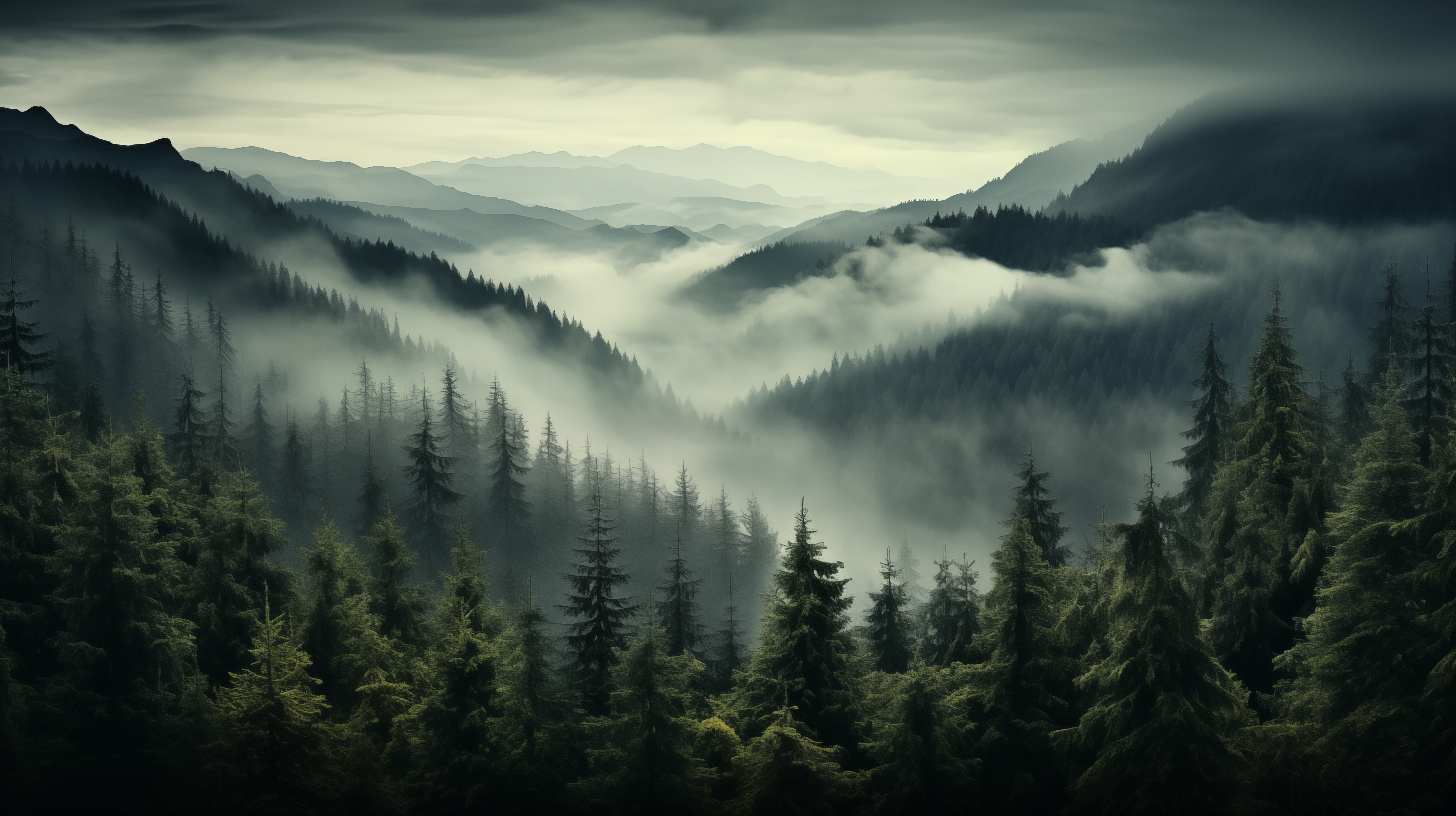 Ai Art, Mist, Forest, Landscape, Hills 5K Desktop and Mobile Wallpaper Background with a maximum resolution of 5824x3264 px.