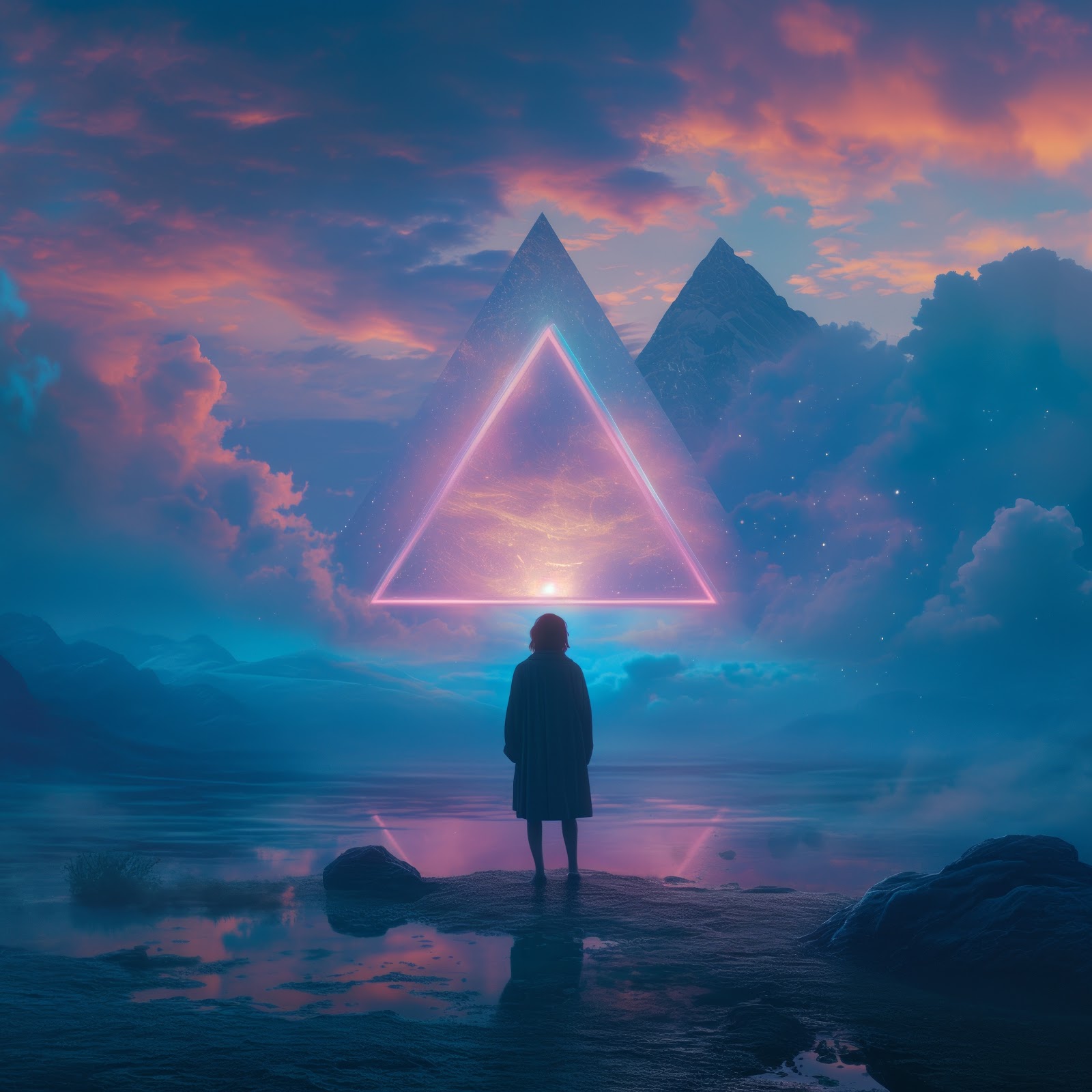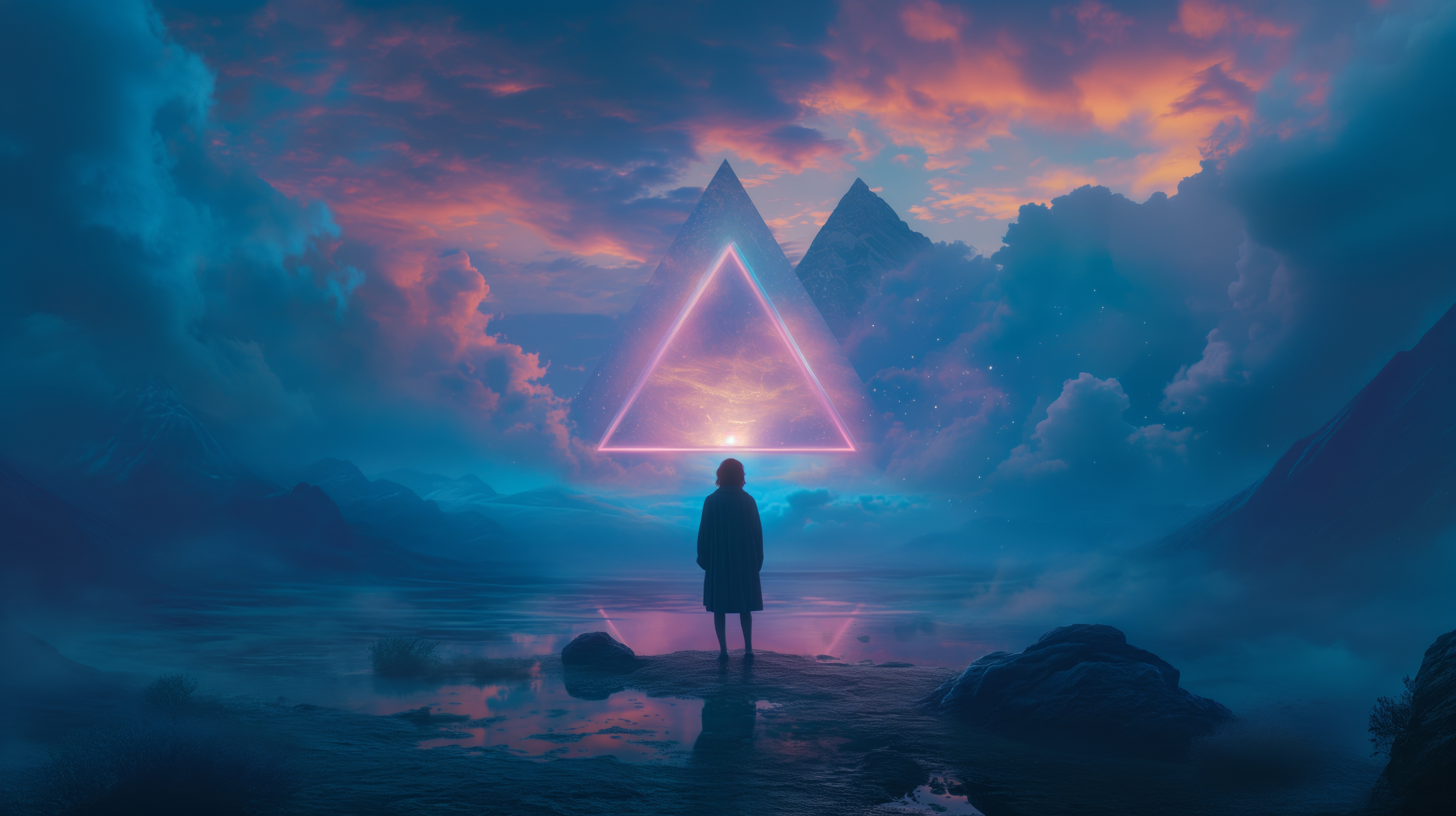 Ai Art, Neon, Synthwave, Triangle, Clouds 5K Desktop Wallpaper
