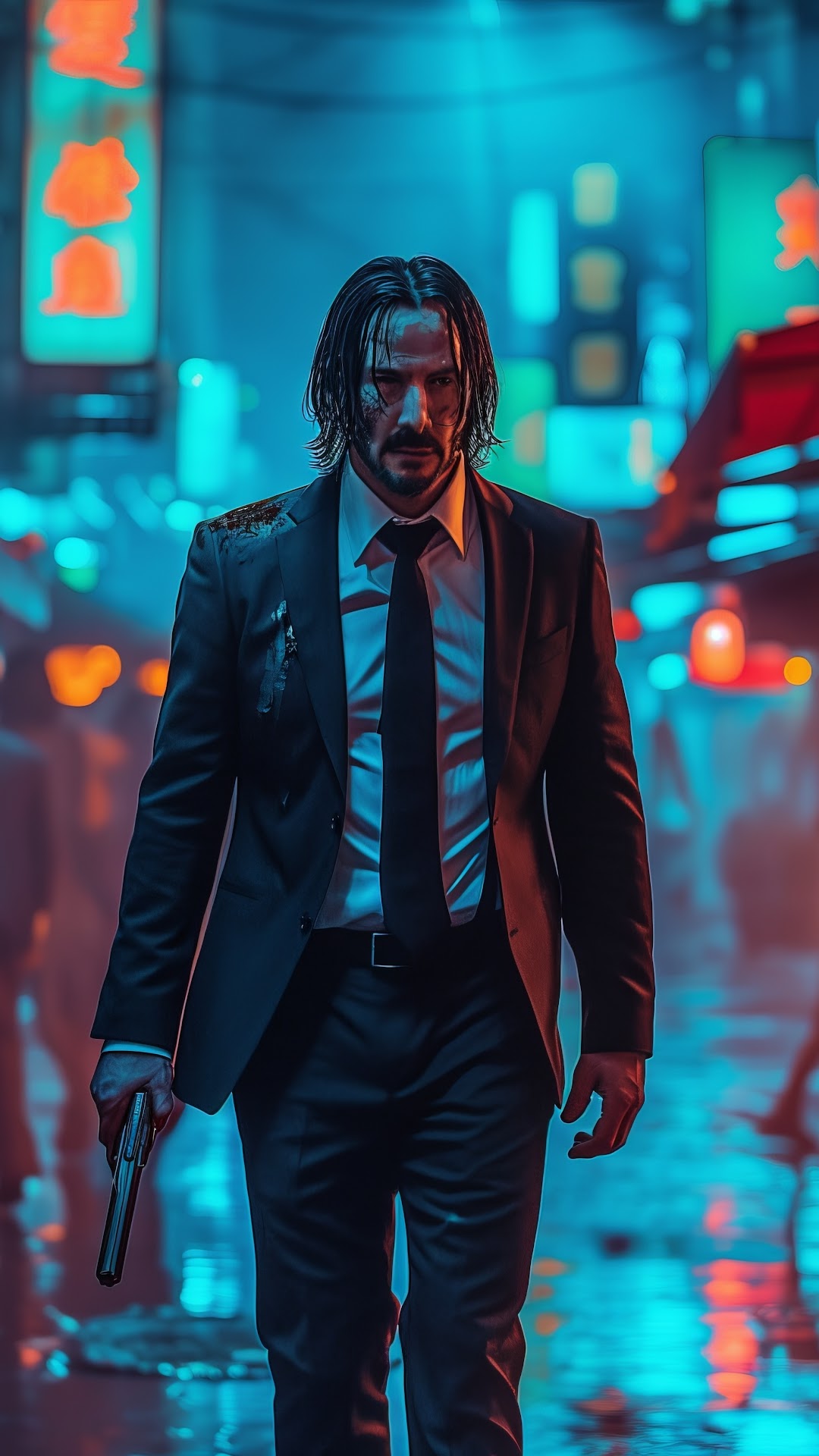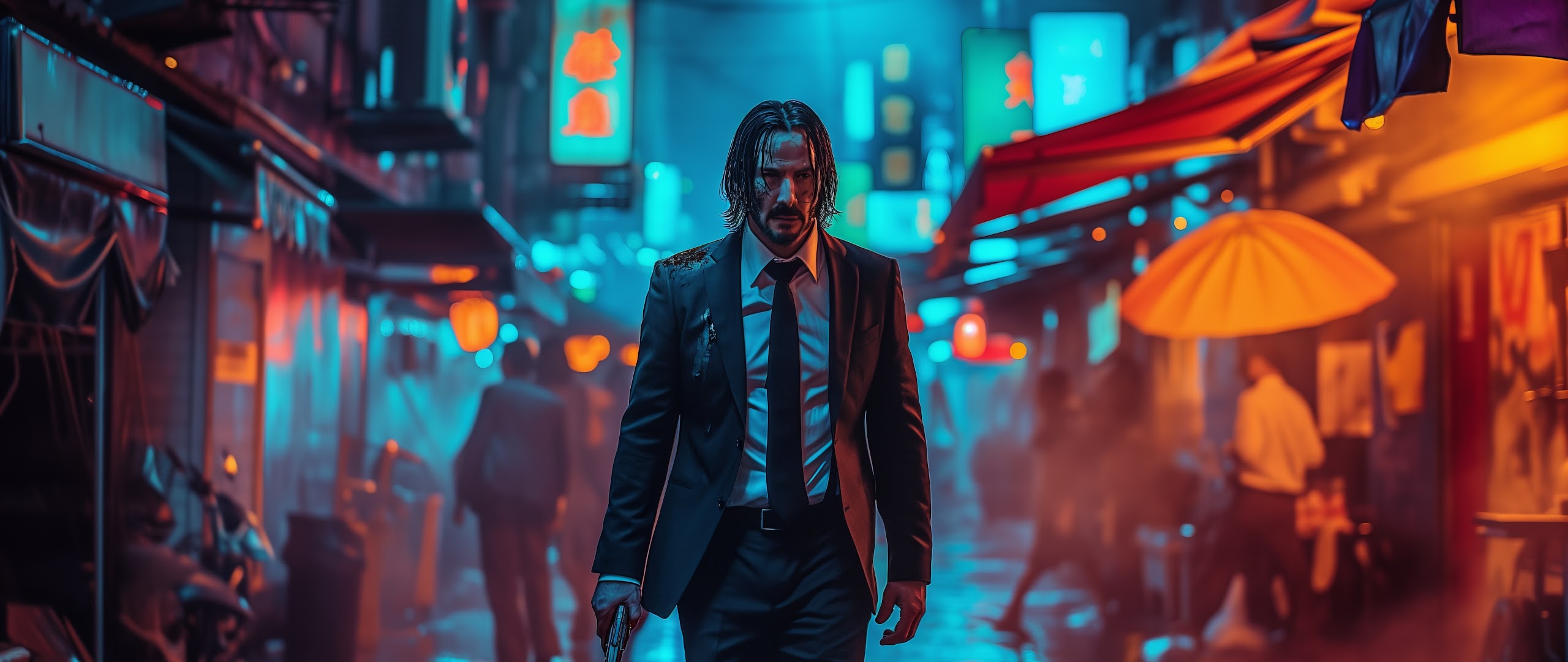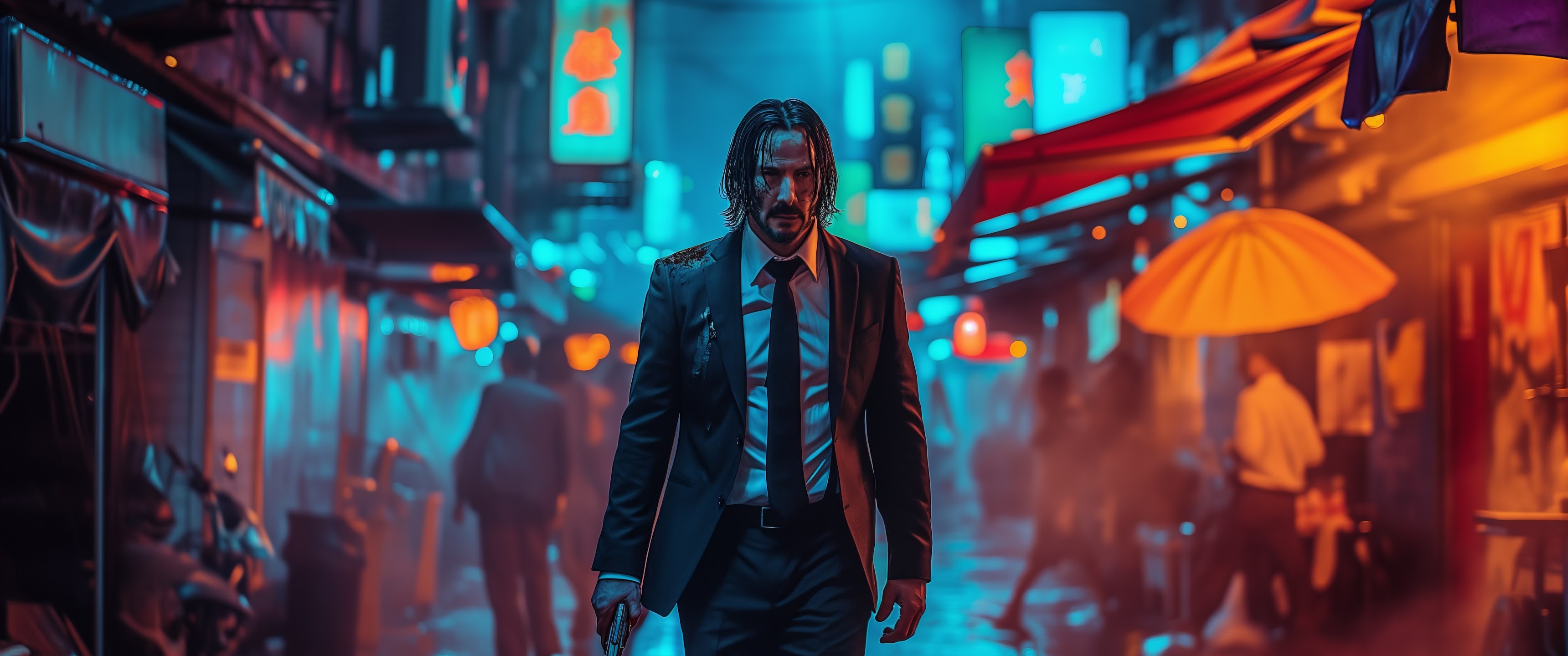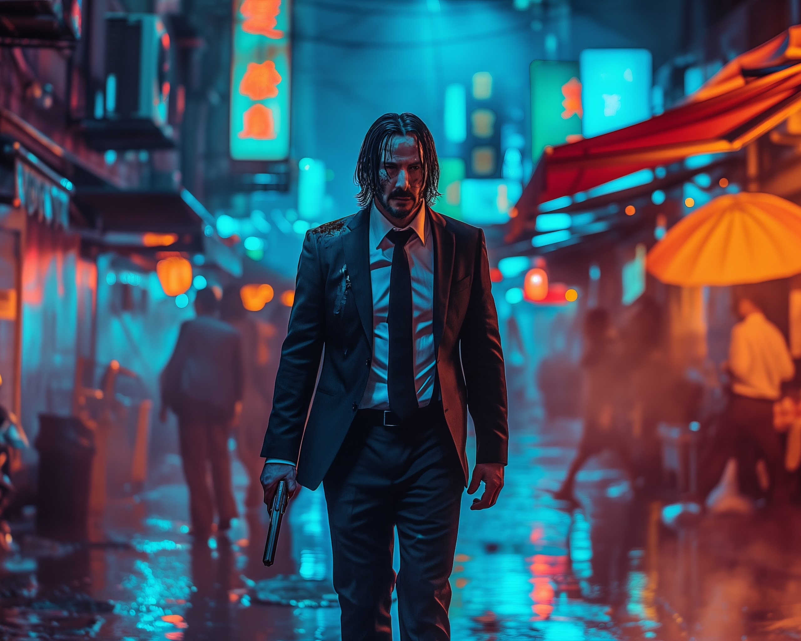 Ai Art, Illustration, City, Neon, John Wick 5K Desktop and Mobile Wallpaper Background with a maximum resolution of 5824x3264 px.