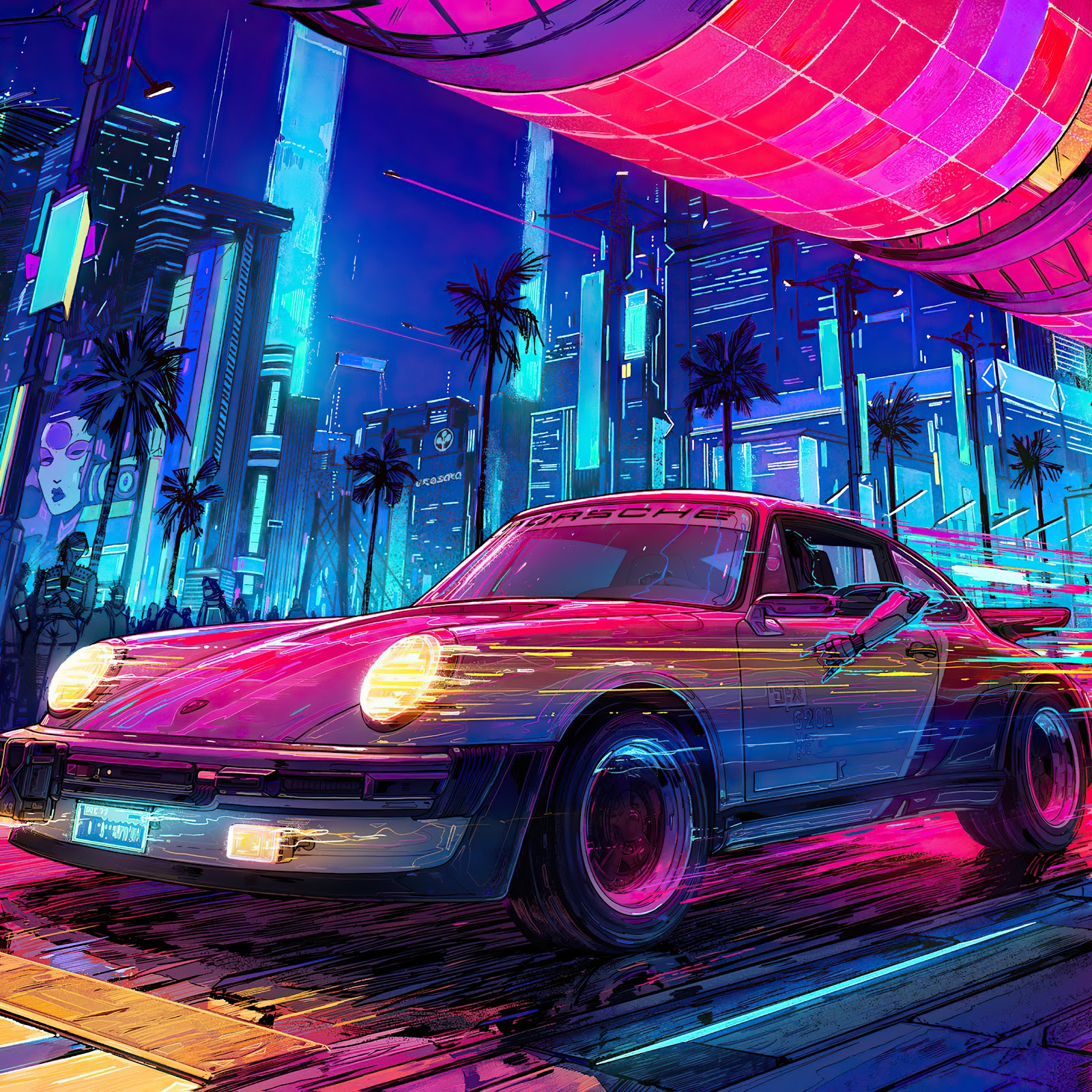 Car, Cyberpunk, Road, Neon, City 4K Desktop and Mobile Wallpaper Background with a maximum resolution of 3840x2322 px.