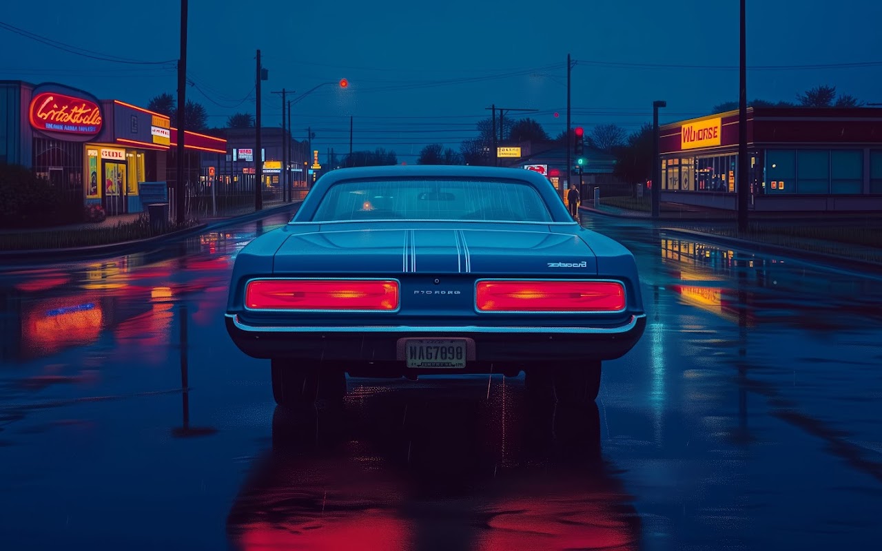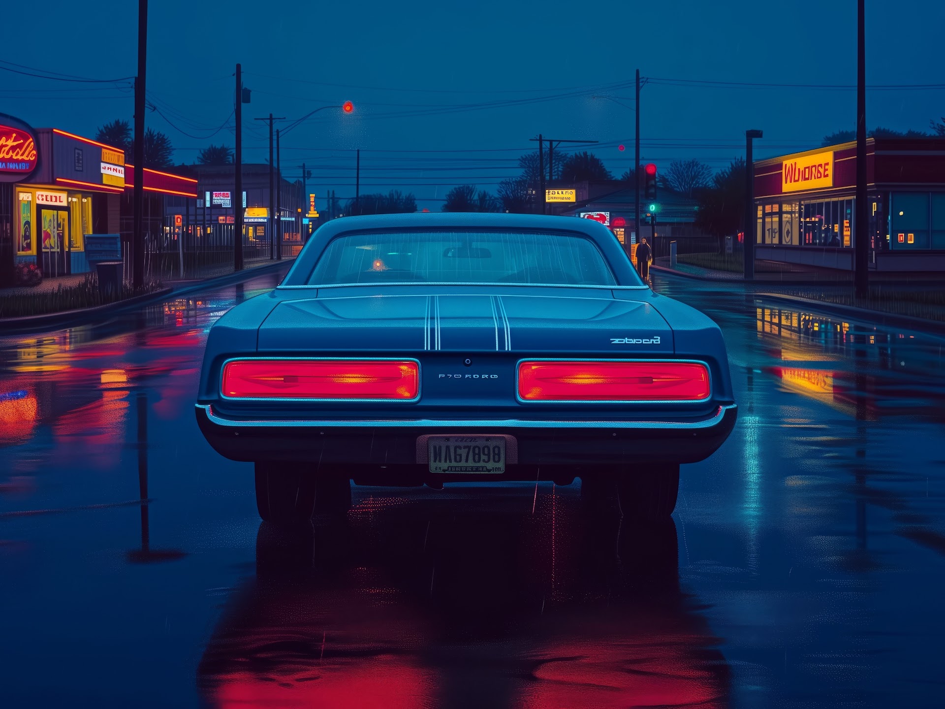Illustration, Ai Art, Car, Taillights, Blue Hour 5K Desktop and Mobile Wallpaper Background with a maximum resolution of 5824x3264 px.