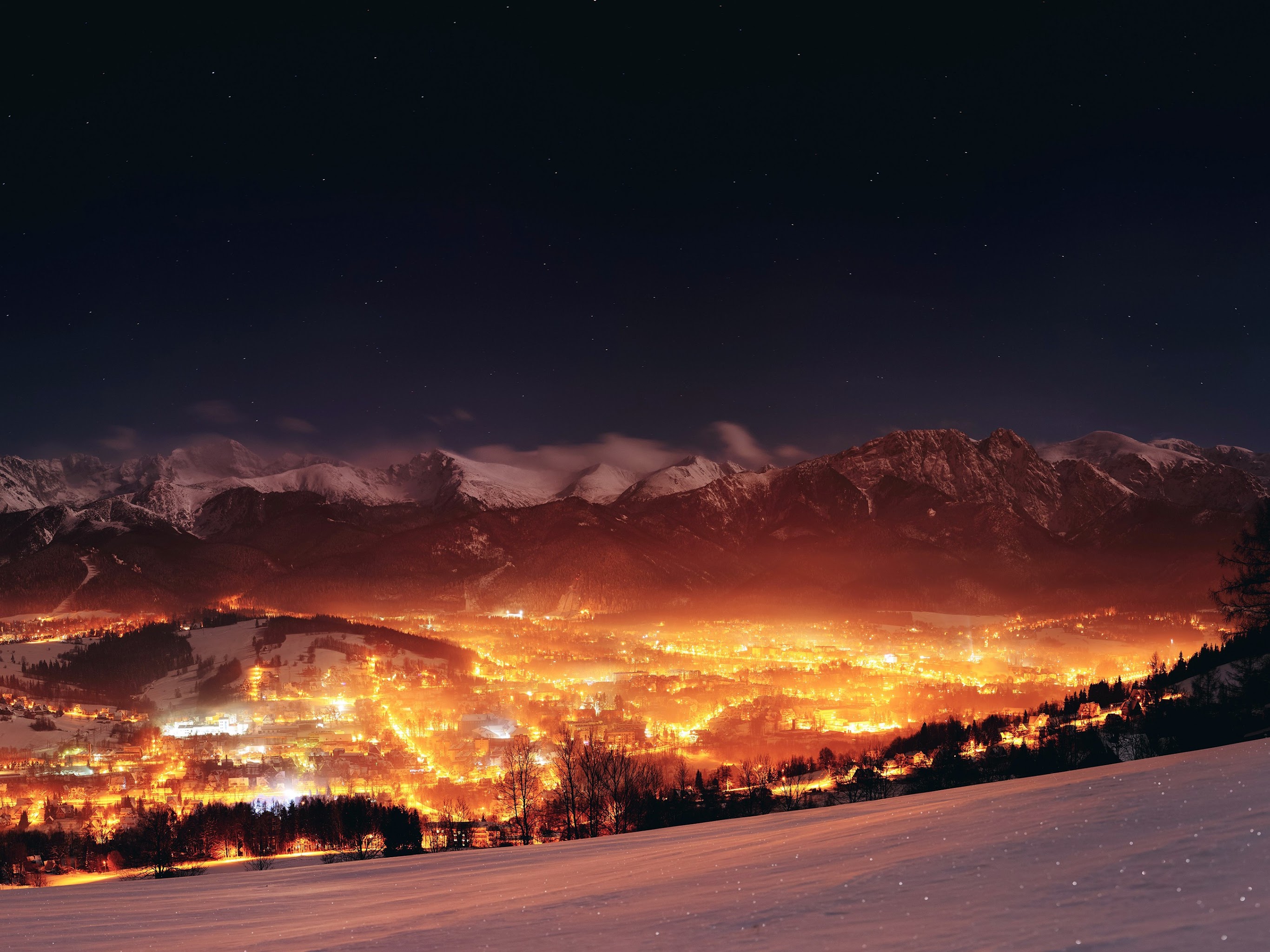 Landscape, Mountains, Lights, Night, Poland 4K Desktop and Mobile Wallpaper Background with a maximum resolution of 3840x2160 px.