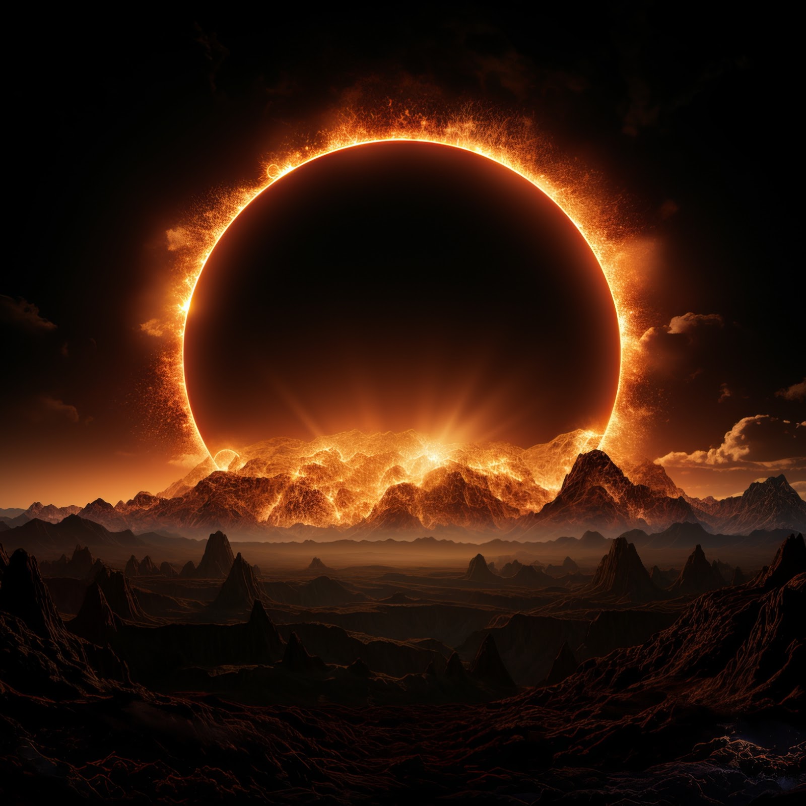 Ai Art, Eclipse , Fire, Landscape, Mountains 2K Desktop Wallpaper