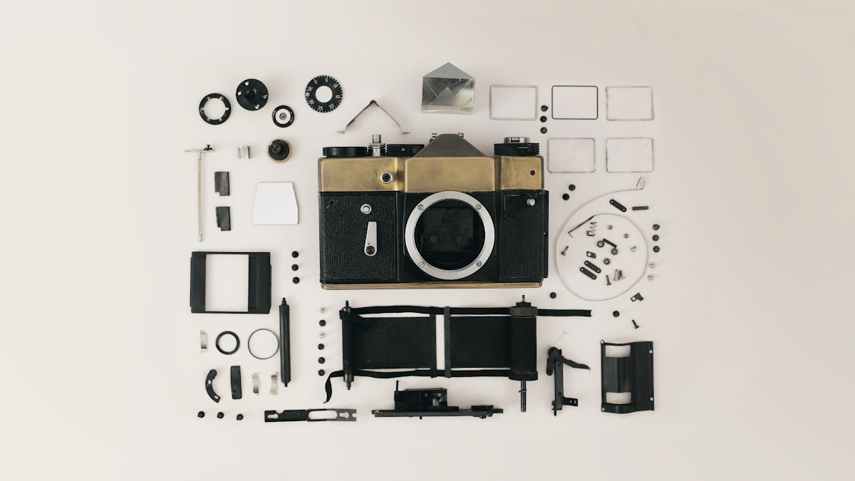 Camera, Flat Lay, Top View, Parts, Pieces 4K Desktop Wallpaper