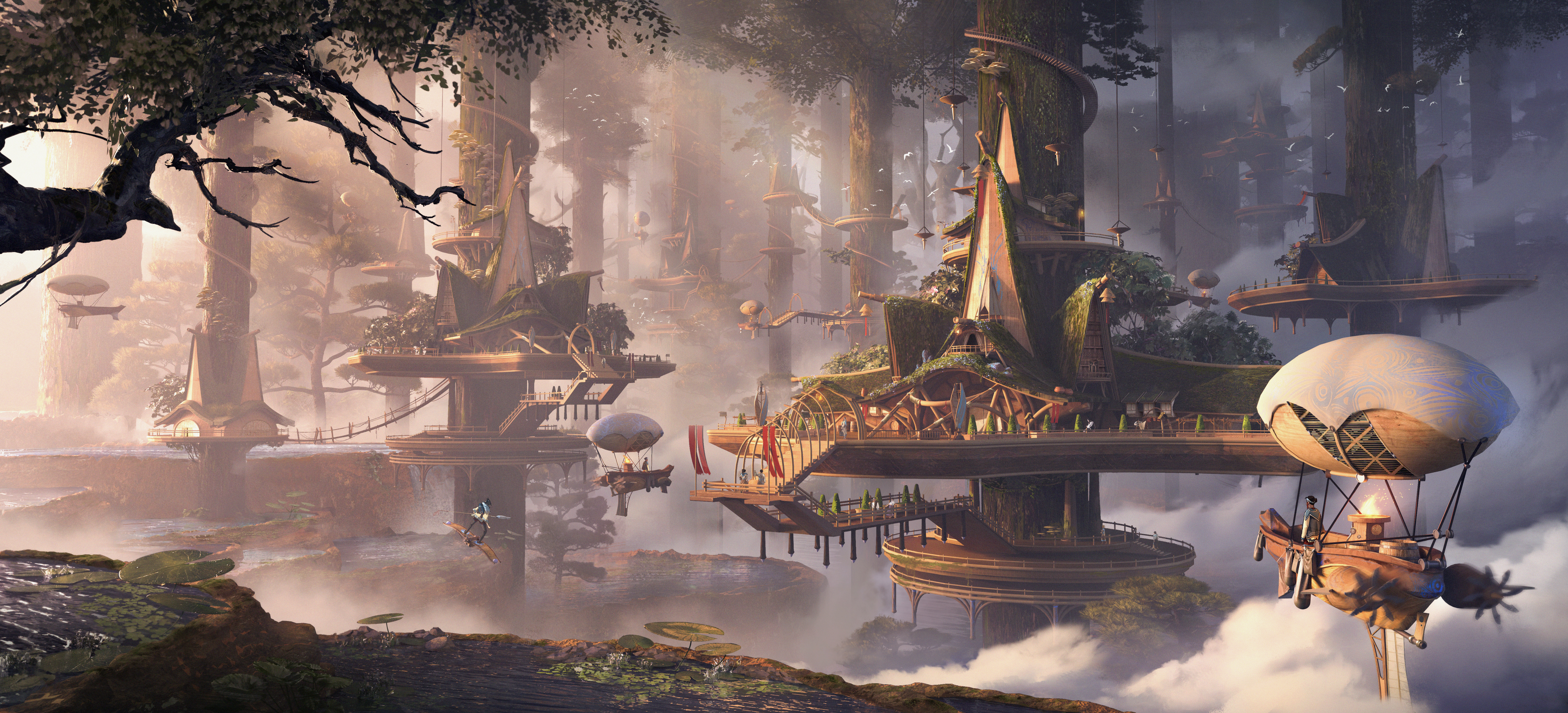Cheng Yi, Landscape, Concept Art, Fantasy Architecture, Fantasy Art 4K Desktop and Mobile Wallpaper Background with a maximum resolution of 6000x2729 px.