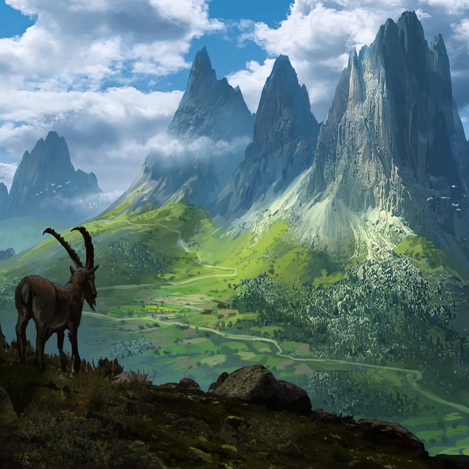 David Frasheski, Clouds, Rocks, Artwork, Goats 4K Desktop and Mobile Wallpaper Background with a maximum resolution of 3840x2259 px.