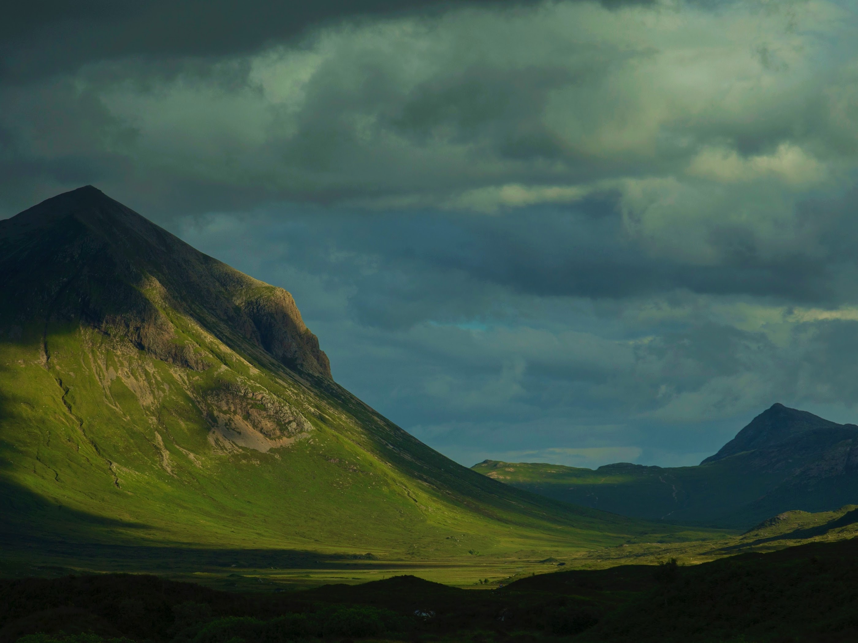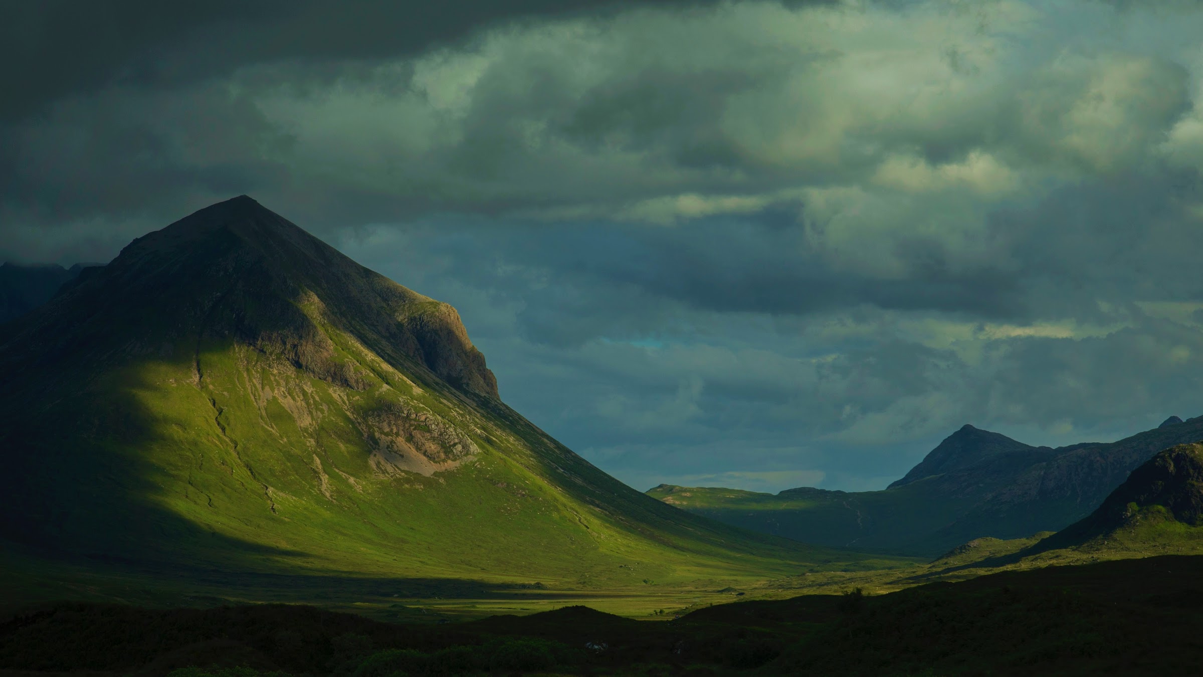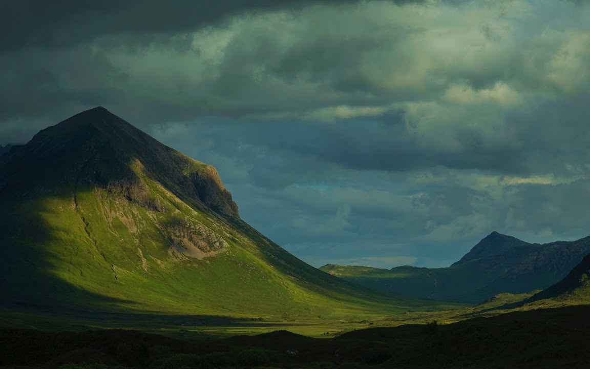 Mountains, Clouds, Sunlight, Monsoon, Grass 4K Desktop and Mobile Wallpaper Background with a maximum resolution of 5581x2472 px.