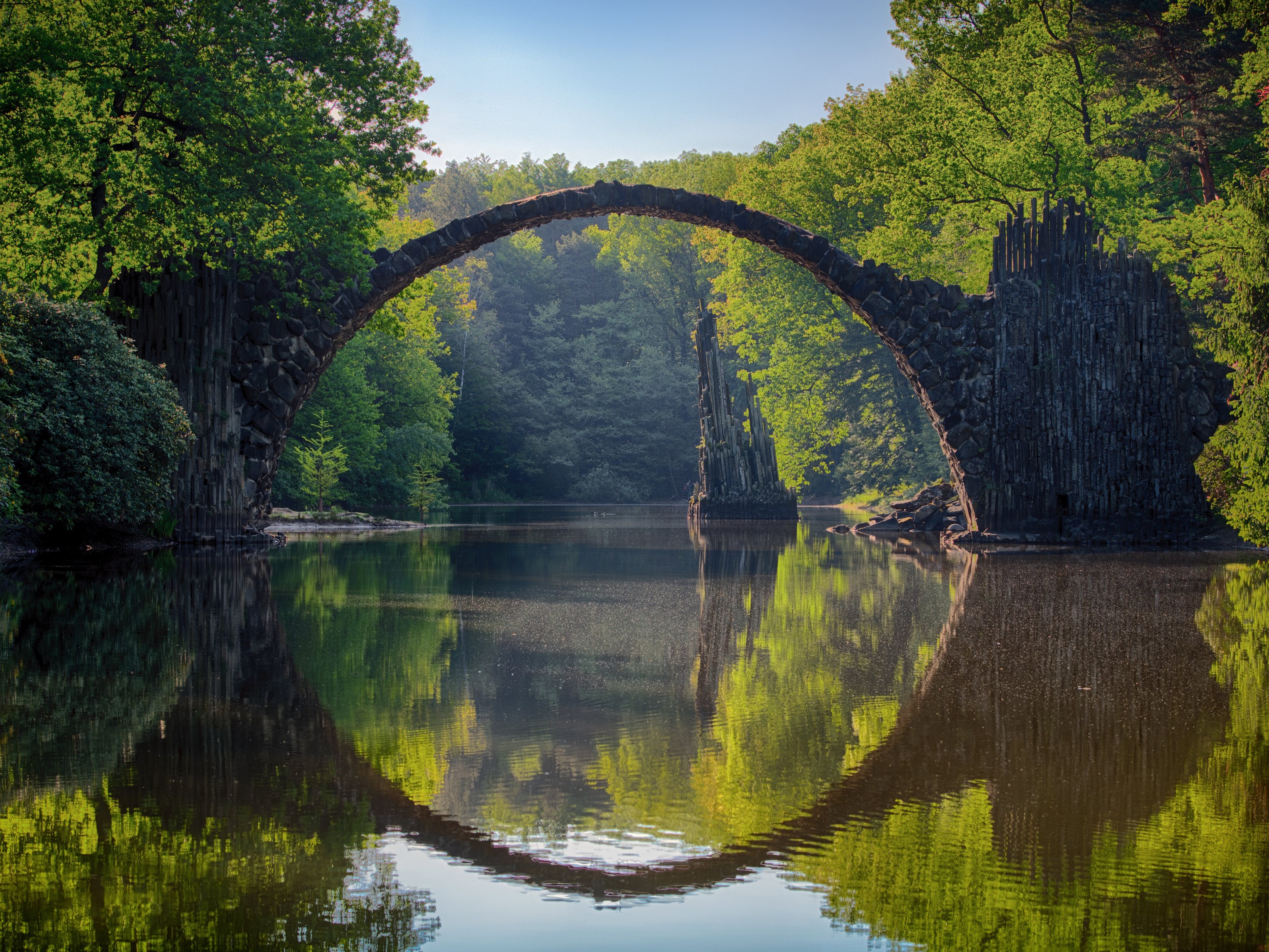 Nature, Landscape, Reflection, Symmetry, Rakotzbrücke Devil'S Bridge 5K Desktop and Mobile Wallpaper Background with a maximum resolution of 6010x4005 px.