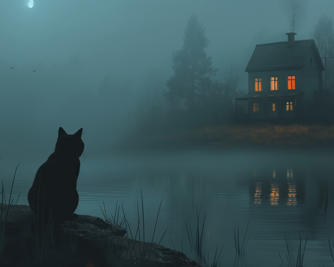 Ai Art, Illustration, Black Cats, House, Lake 5K Phone Wallpaper