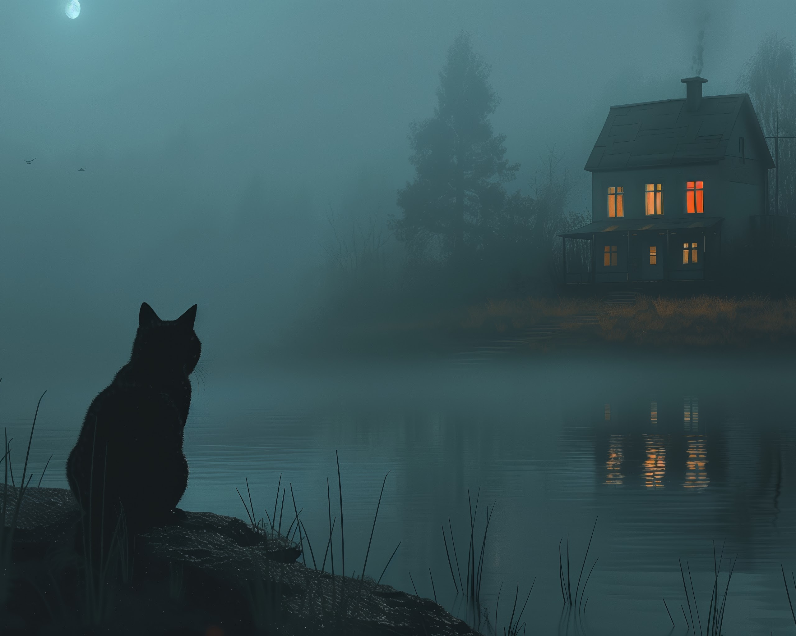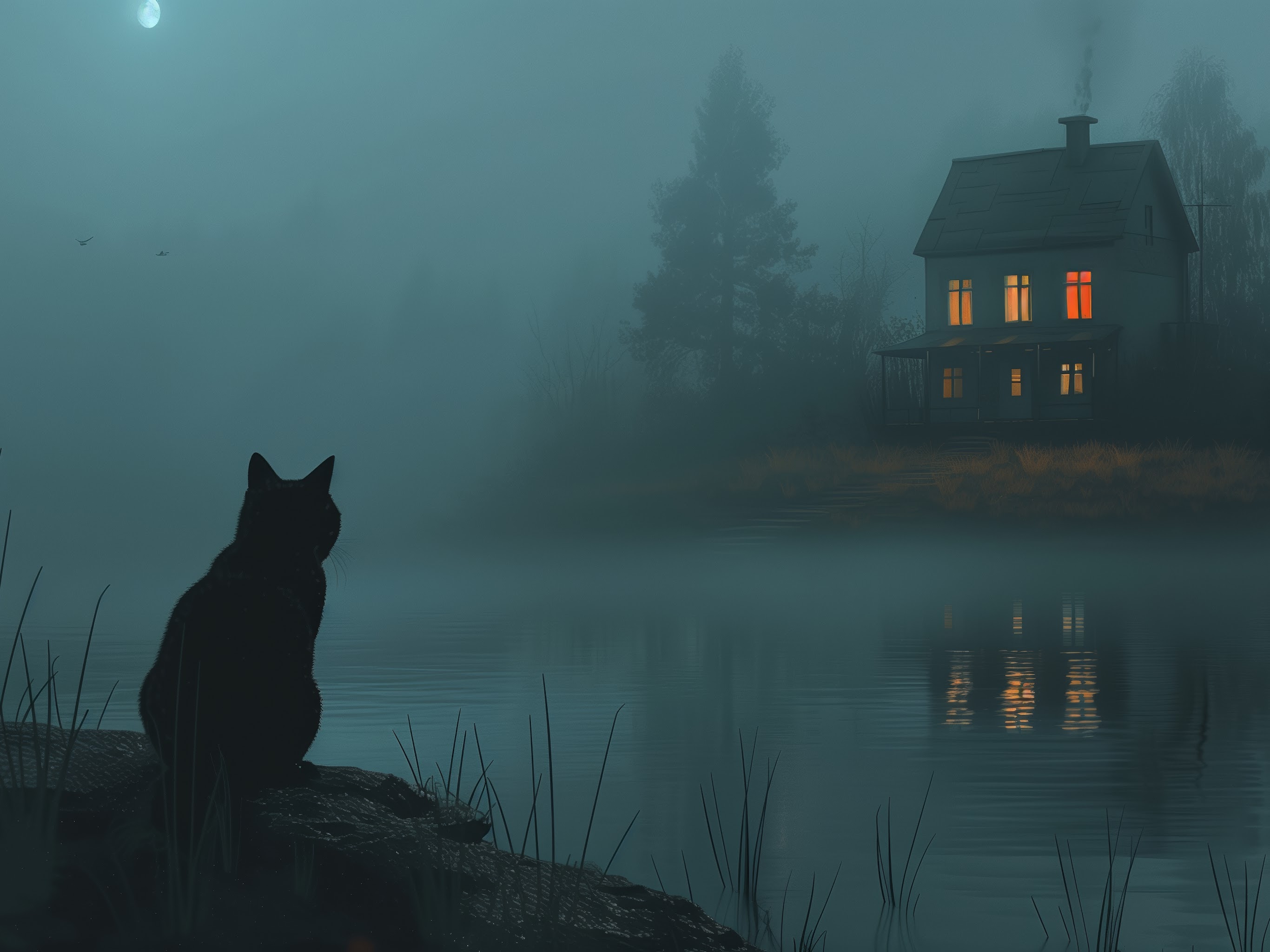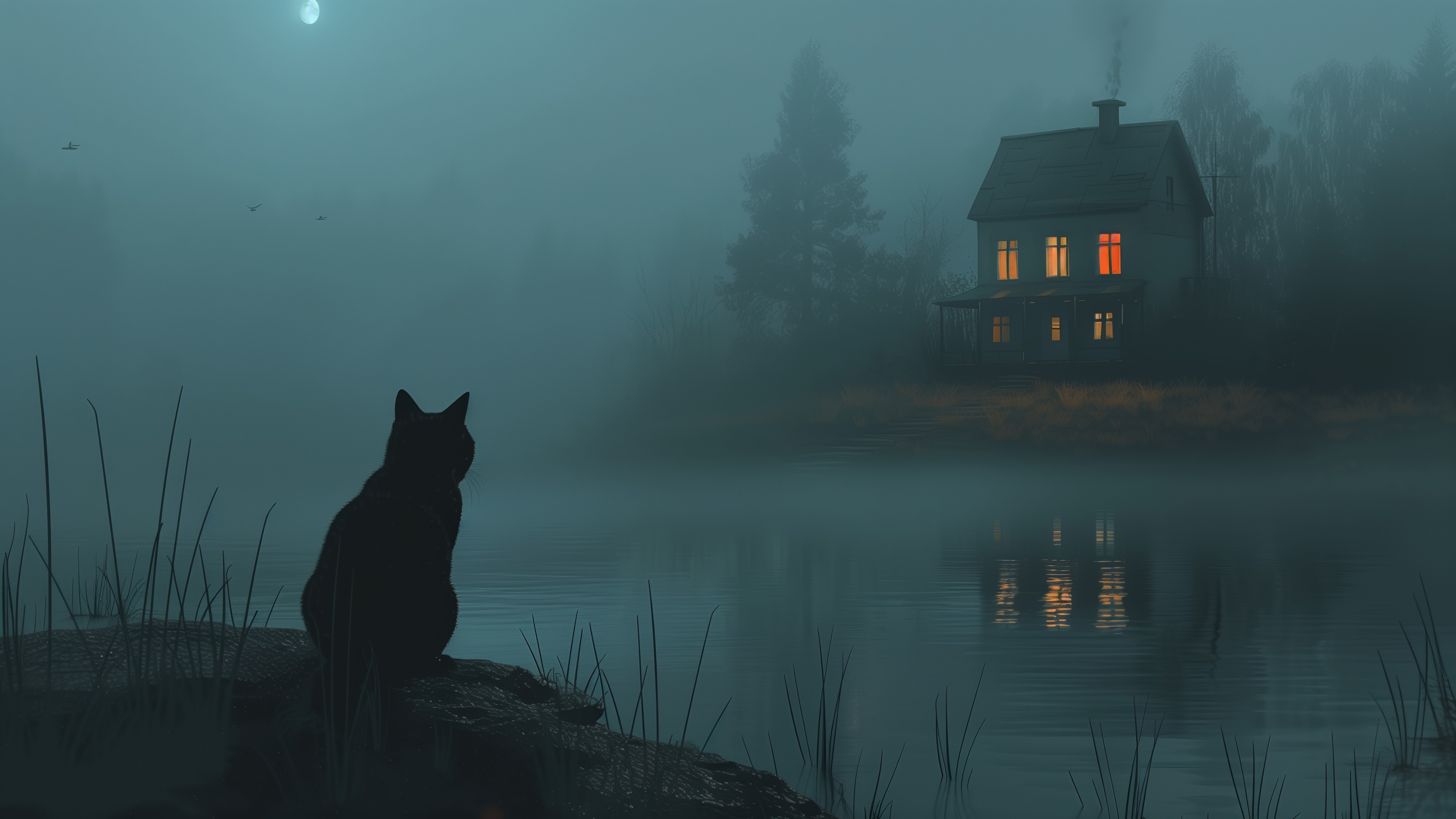 Ai Art, Illustration, Black Cats, House, Lake 5K Desktop and Mobile Wallpaper Background with a maximum resolution of 5824x3264 px.
