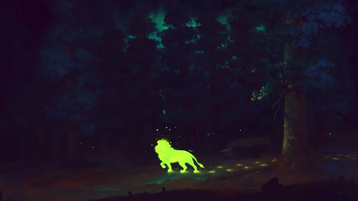 Digital Art, Lion, Forest, Glowing Full HD Desktop Wallpaper