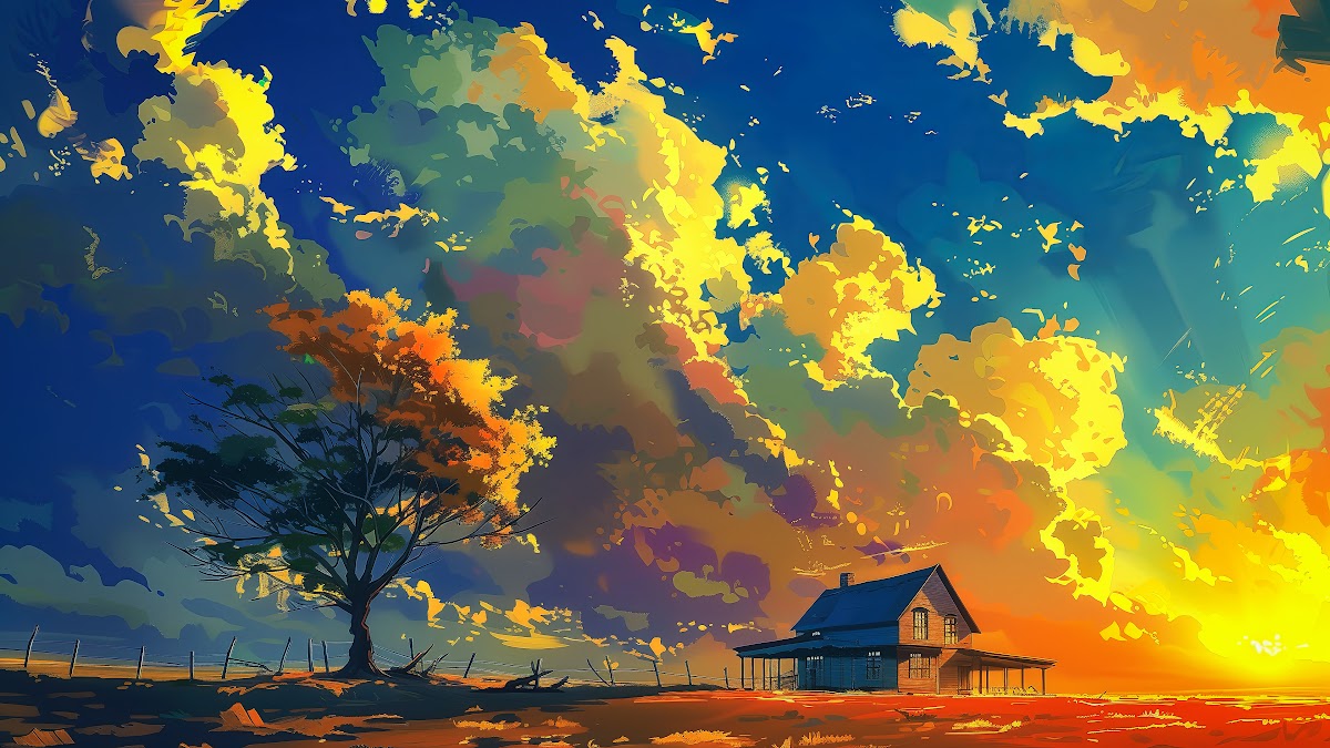 Clouds, House, Trees, Illustration, Colorful 4K Desktop and Mobile Wallpaper Background with a maximum resolution of 3840x2160 px.